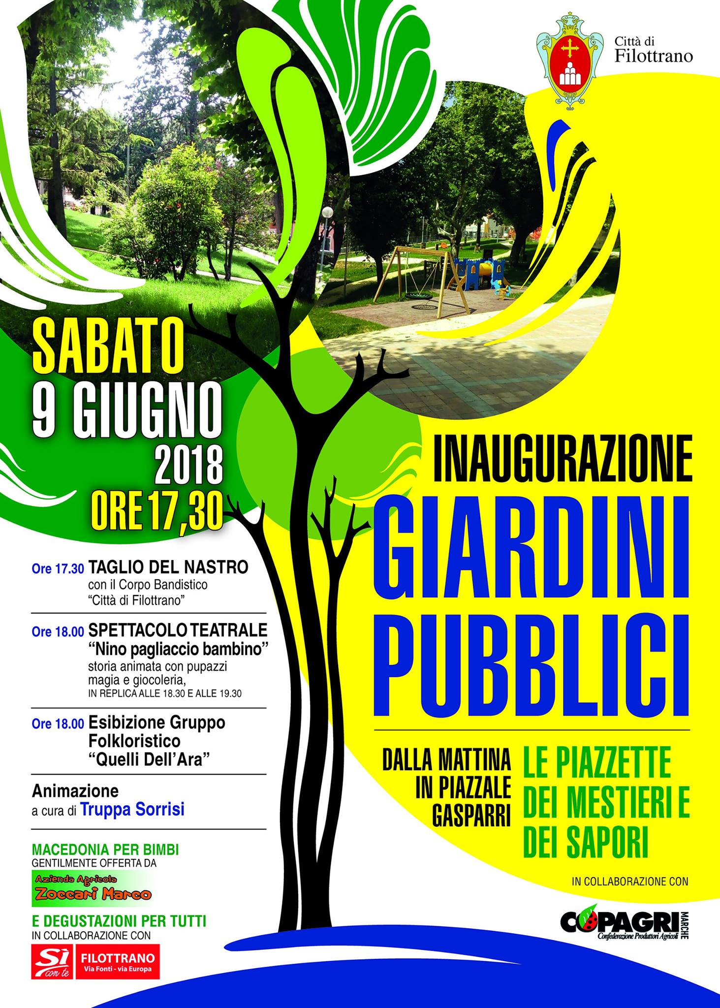 Quando manca ormai un anno alla conclusione del mandato comincia il periodo di consegna delle opere messe in cantiere dall’amministrazione Giulioni. Dopo l’inaugurazione lo scorso aprile del palazzo monumentale, ex convento San Francesco, domani, sabato 9 giugno, saranno riaperti i giardini pubblici “G. Morigi”. Il taglio del nastro è previsto alle 17:30. Sarà un pomeriggio di festa con la presenza della banda, l’animazione a cura dell’associazione Truppa Sorrisi, lo spettacolo teatrale per i più piccoli alle 18:00 e l’esibizione del gruppo folkloristico Quelli dell’ara. Non mancheranno neppure i momenti di degustazione dei prodotti offerti dal supermercato Sì con Te di Filottrano e della macedonia per bambini dell’azienda agricola Marco Zoccari. Sin dalla mattinata invece l’adiacente piazzale Gasparri sarà trasformato da Copagri Marche nella “Piazzetta dei mestieri e dei sapori”. “L’obiettivo che ci eravamo prefissati ad inizio mandato – ricorda il sindaco Giulioni – era di migliorare la nostra città e fare in modo che i cittadini si riappropriassero dei suoi spazi. Con l’imminente arrivo dell’estate i giardini diventeranno sicuramente un prezioso punto di incontro e di relax per tanti filottranesi. Invito quindi tutti a presenziare all’inaugurazione, sarà l’occasione per ritrovarci tutti insieme”.