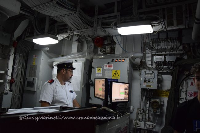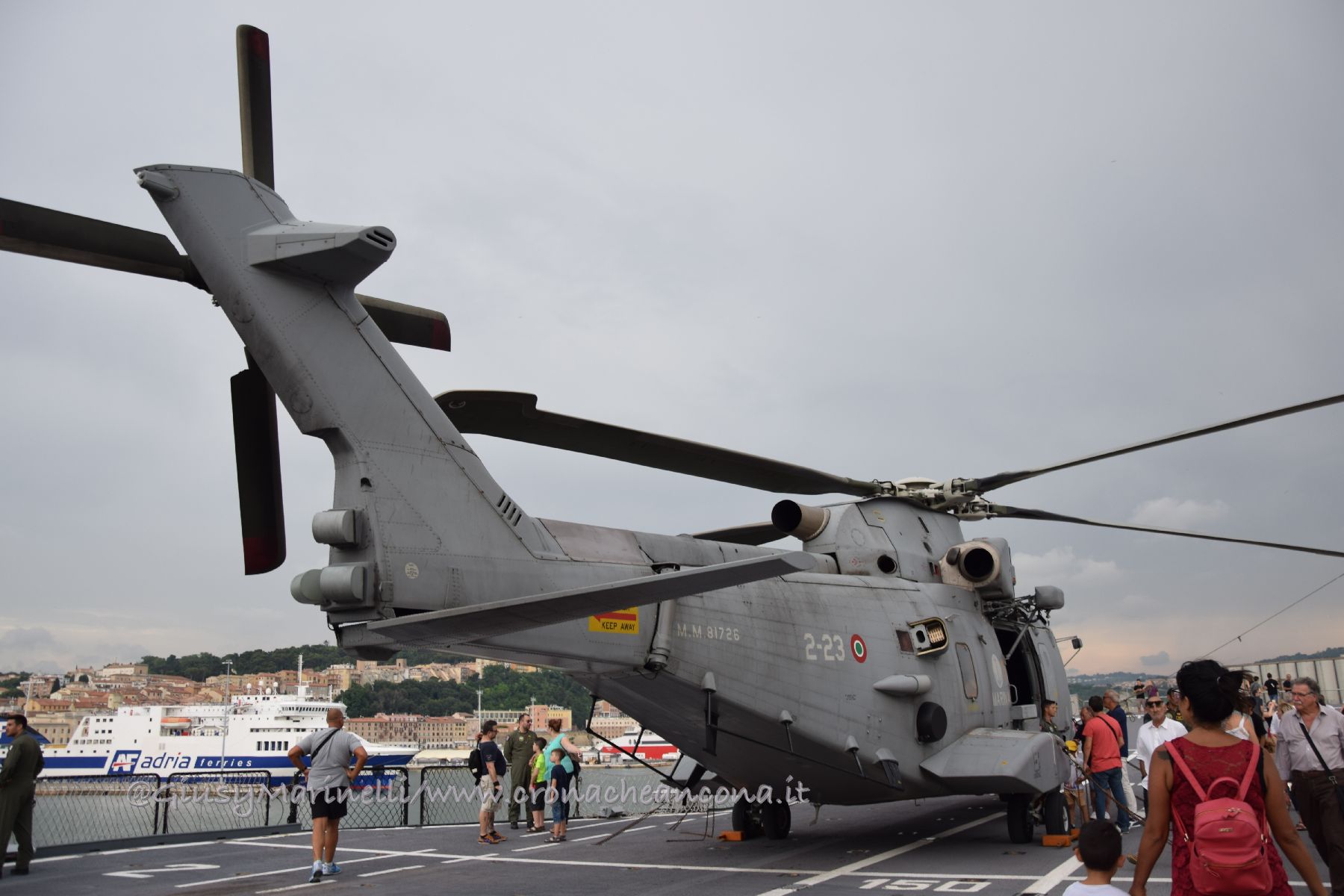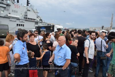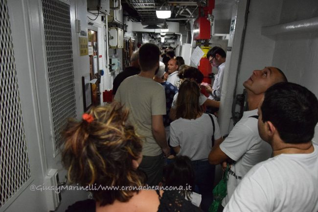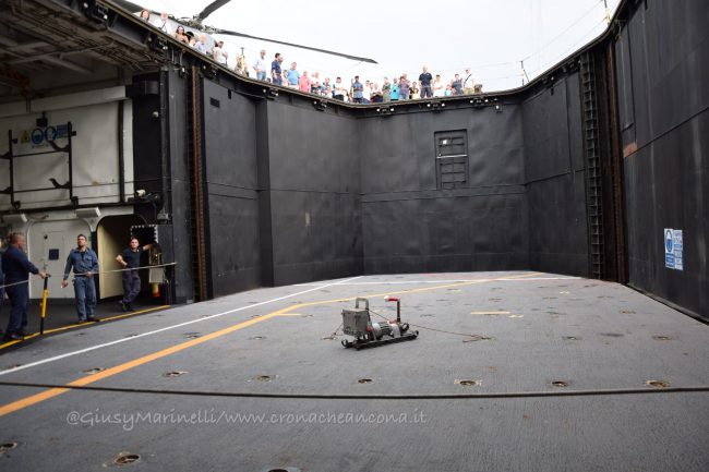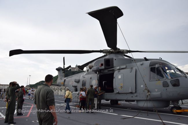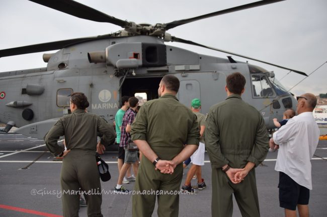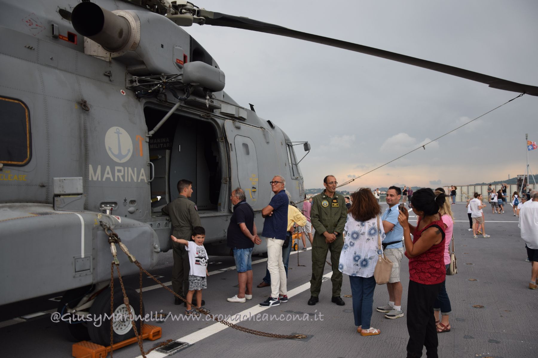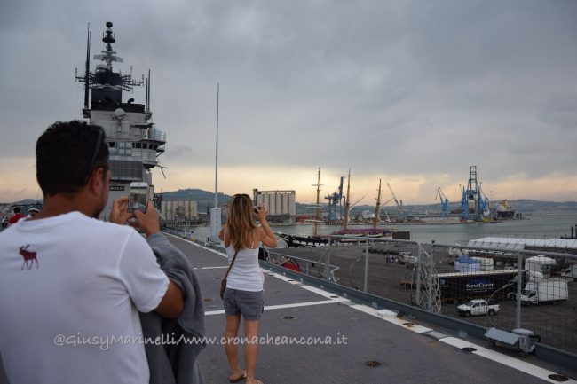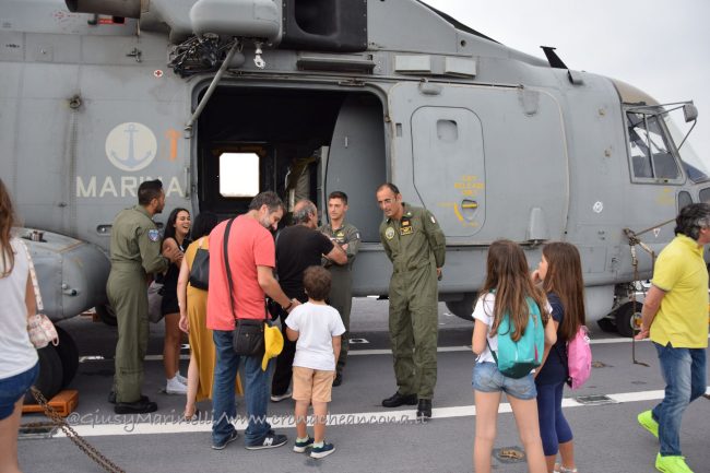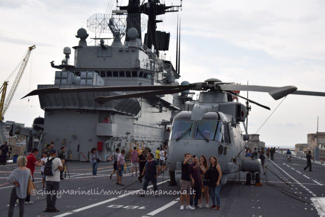 In particolare ha attratto molto i visitatori la storica Garibaldi, la più piccola portaeromobili al mondo, ma la prima realizzata dalla Marina Militare italiana, che infatti proprio qualche giorno fa ha compiuto 35 anni. La nave fu realizzata nel 1983 (entrata in servizio 2 anni dopo) a seguito della necessità, oltre che di potenziare e completare una formazione navale, anche di poter esercitarne le funzioni di centro di comando, coordinamento e controllo. Nella giornata di ieri c’è stata una buona affluenza di visitatori -che la Marina crede aumenti in questi giorni- tra i quali molti bambini, che accompagnati dai genitori hanno girato in lungo e in largo i 180,2 m di lunghezza per i 30,4 di larghezza del ponte di volo. Qui hanno potuto anche scattare fotografie all’elicottero H101, che tra l’altro è il più grande. Attualmente infatti da questo mezzo atterranno e decollano soltanto elicotteri, ma la nave conserva le funzioni anche per gli aerei, come dimostra l’inclinazione del ponte verso prua.
