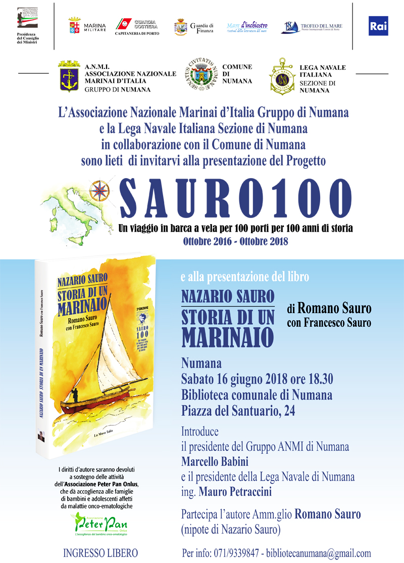 “L’ammiraglio Sauro, ormai in pensione dopo 42 anni di servizio nella Marina Militare, utilizza ogni sosta per portare il racconto dei marinai che nel primo conflitto mondiale, con il sacrificio e l’impegno, formarono l’identità europea e nazionale.- ricorda un comunicato stampa del Comune di Numana – Attraverso la commemorazione della figura di Nazario Sauro, infatti, il nipote Romano sta promuovendo il recupero di storie, racconti e luoghi della memoria sullo sfondo della Grande Guerra sul mare. Anche a Numana, come negli altri luoghi interessati dal progetto, verrà presentato il libro Nazario Sauro. Storia di un marinaio, scritto dall’ammiraglio insieme al figlio Francesco e giunto alla terza edizione, nel quale tesse la storia famigliare con il racconto storico. L’interesse di promuovere il recupero della memoria s’intreccia e si coniuga con lo scopo solidale: i diritti d’autore del libro sull’illustre patriota, rieditato in occasione del centenario, saranno, infatti, devoluti all’Associazione Peter Pan Onlus di Roma, in prima linea per accoglienza e servizi offerti gratuitamente alle famiglie di bambini e adolescenti affetti da malattie onco-ematologiche.