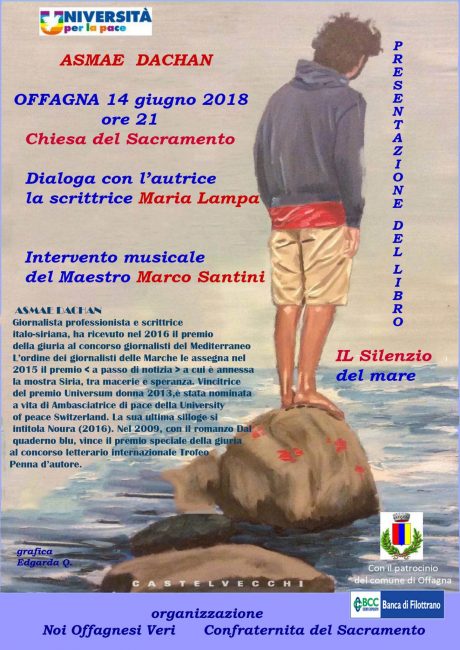Da sempre persegue con passione i sogni. E il suo, quello di lanciare un messaggio di pace dando voce a chi è stato privato dell’esercizio dei diritti civili e sociali, l’ha portata davvero lontano. ‘Il silenzio del mare’, l’ultimo libro di Asmae Dachan, giornalista italo-siriana, racconta proprio del dramma del popolo siriano e sarà presentato giovedì prossimo, 14 giugno, alle ore 21, nelle chiesa del Sacramento di Offagna. L’autrice dialogherà con la scrittrice Maria Lampa e la serata, organizzata dal gruppo social ‘Noi Offagnesi veri’ e dalla Confraternita del Sacramento con il patrocinio gratuito del Comune, sarà costellata anche di un intermezzo musicale eseguiti dal maestro Marco Santini, il violista che ha composto il brano ‘Il Cristo delle Marche’.