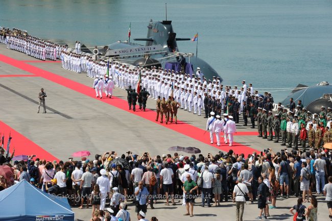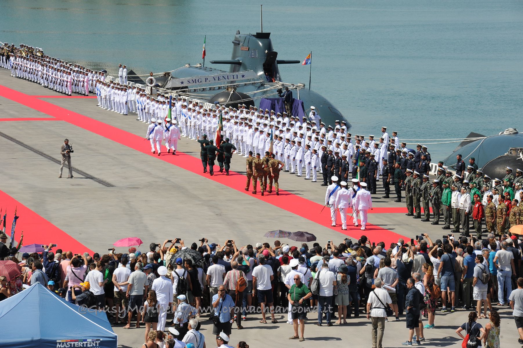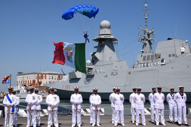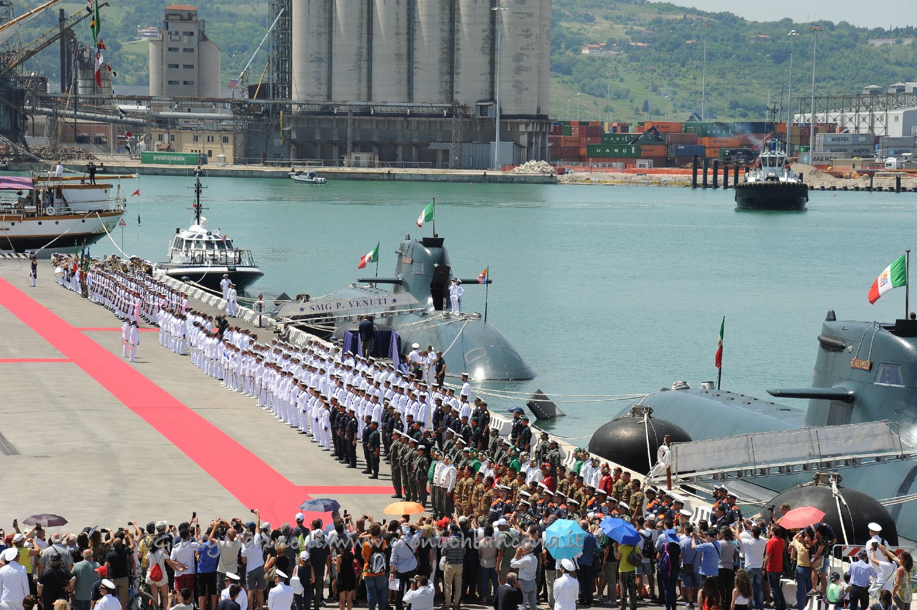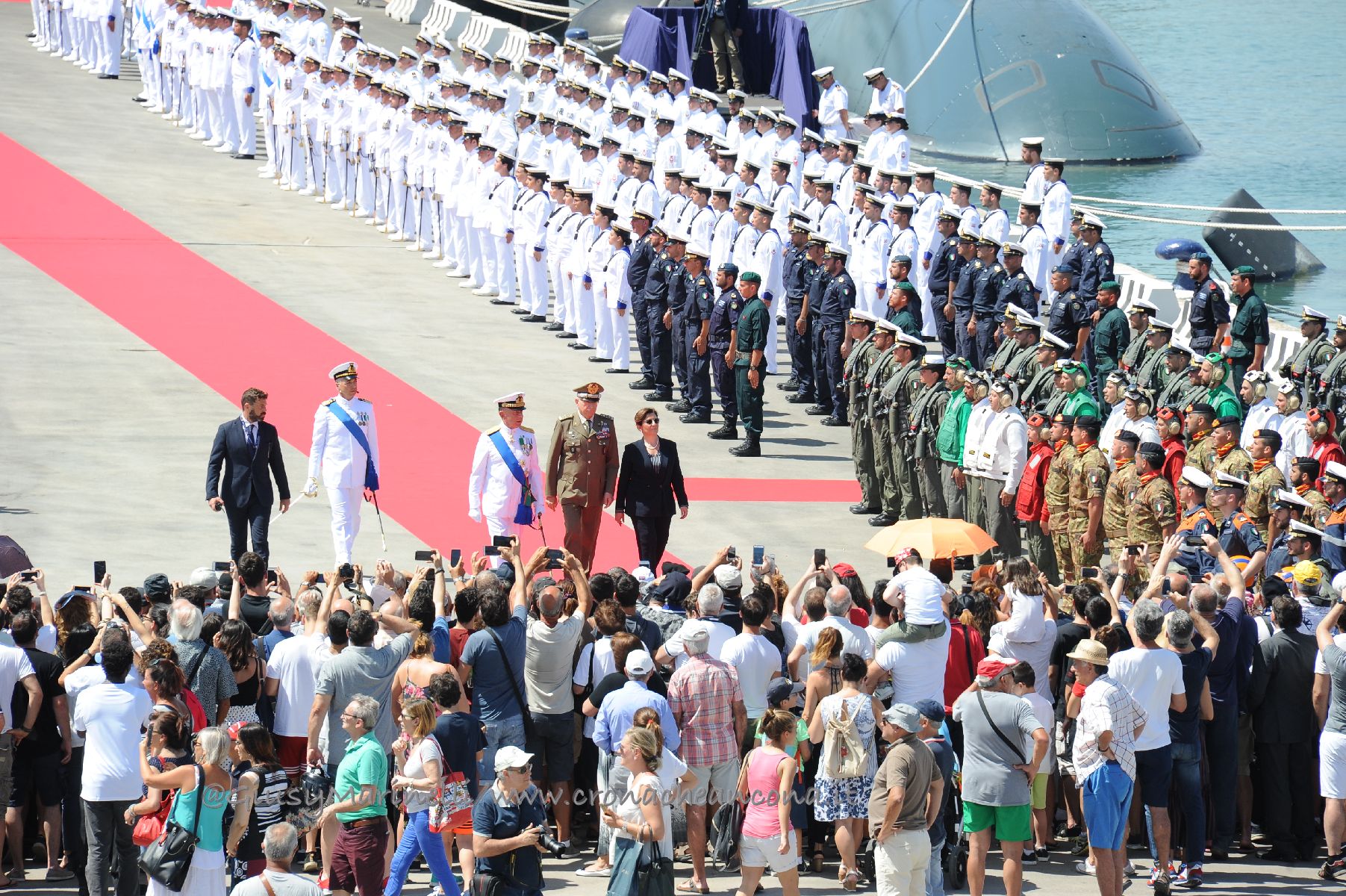 Contemporaneamente all’arrivo del ministro, accompagnata dal capo di stato maggiore della Marina e dal capo di stato maggiore della Difesa, i cieli sono stati teatro dell’esibizione di tre Av-8b della Marina, tre aerei a decollo corto e atterraggio verticale. Un colpo d’occhio eccezionale, poi, è stato dato dall’atterraggio in acqua, tra uno dei sommergibili e la Rizzo, di quattro paracadutisti che hanno mostrato le bandiere della Marina Militare e dell’Italia, con tanto di fumogeni bianchi, verdi e rossi.