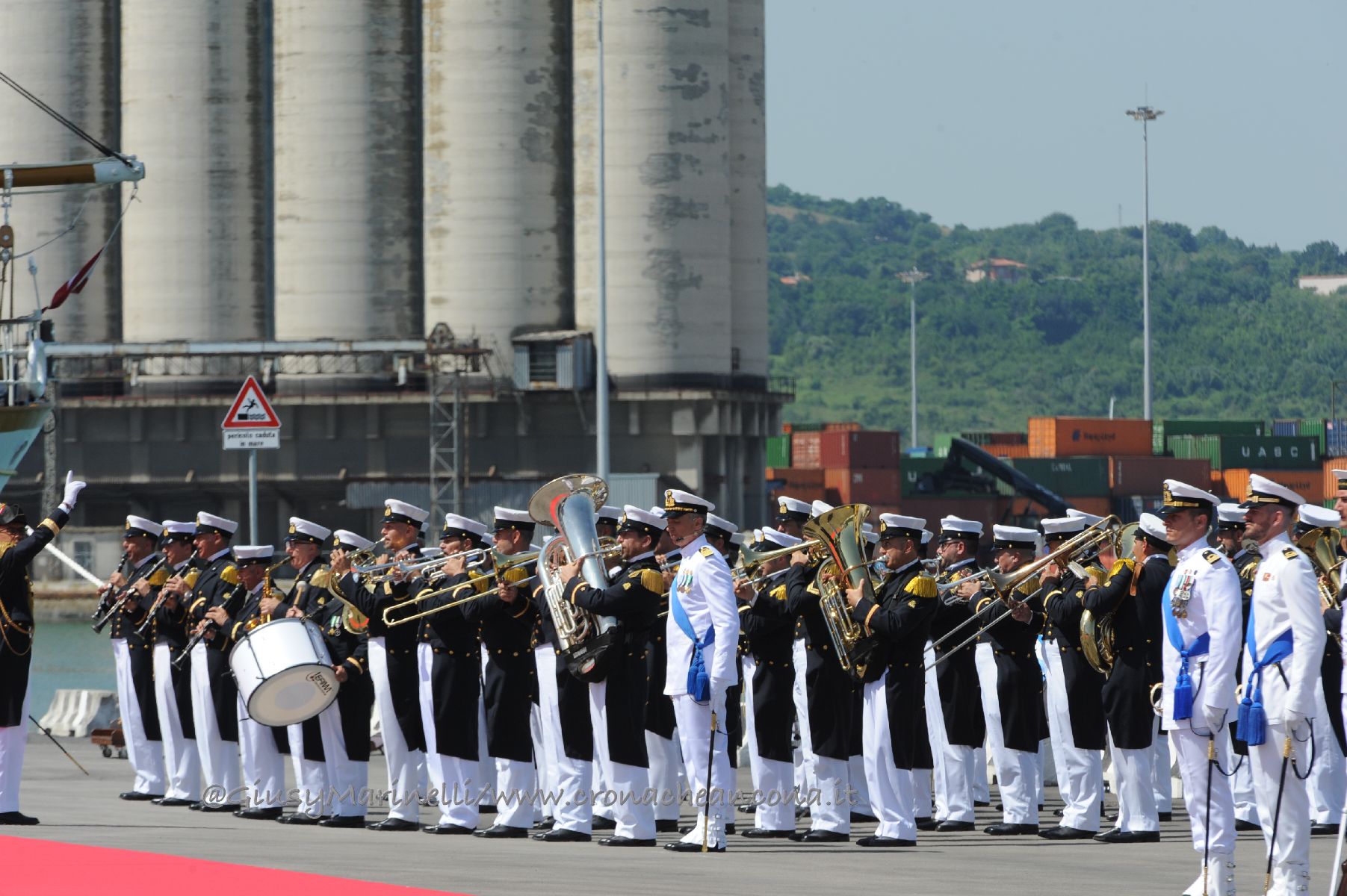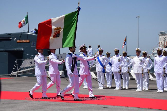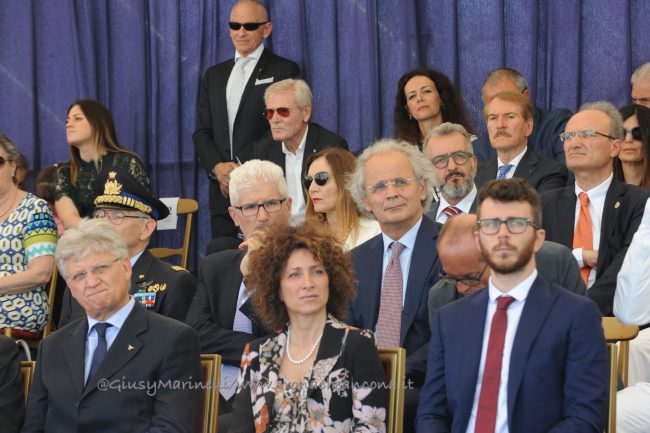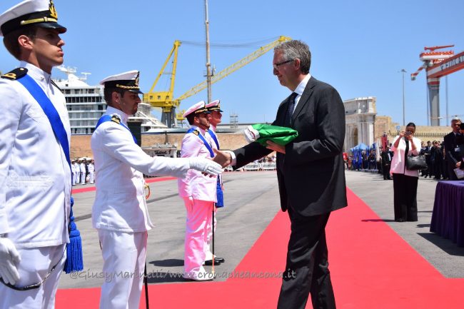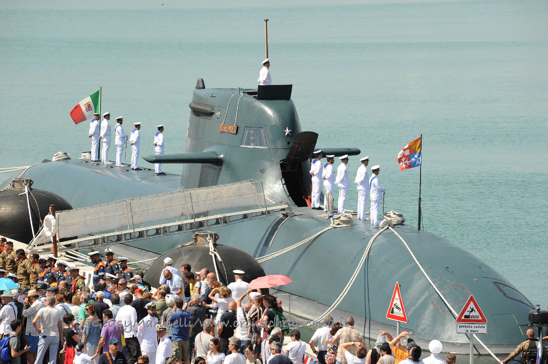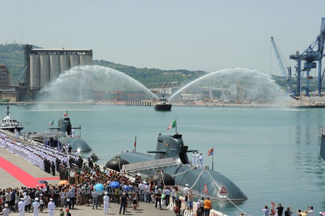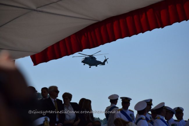 Contemporaneamente all’arrivo del ministro, accompagnata dal capo di stato maggiore della Marina e dal capo di stato maggiore della Difesa, i cieli sono stati teatro dell’esibizione di tre Av-8b della Marina, tre aerei a decollo corto e atterraggio verticale. Un colpo d’occhio eccezionale, poi, è stato dato dall’atterraggio in acqua, tra uno dei sommergibili e la Rizzo, di quattro paracadutisti che hanno mostrato le bandiere della Marina Militare e dell’Italia, con tanto di fumogeni bianchi, verdi e rossi.