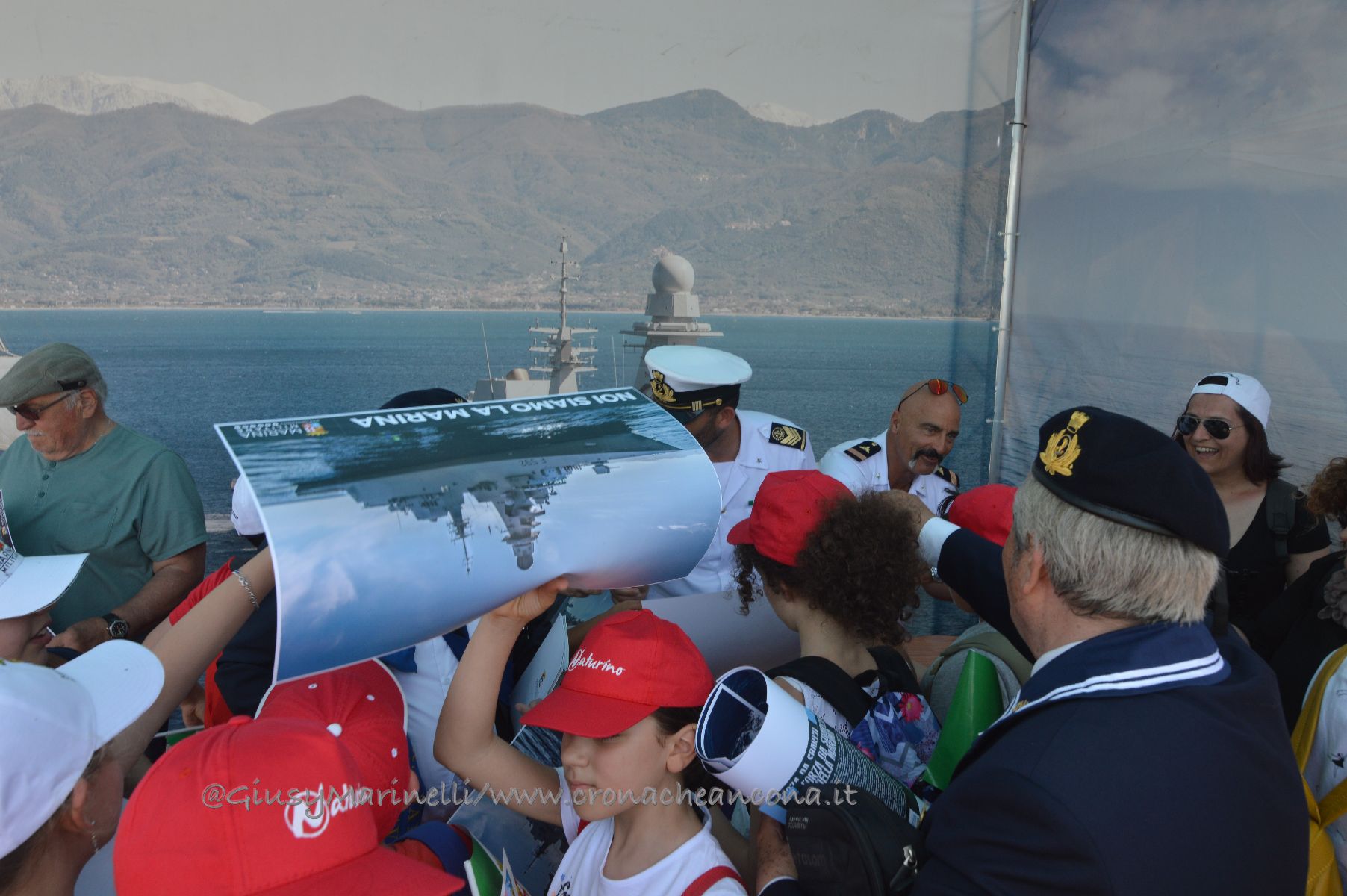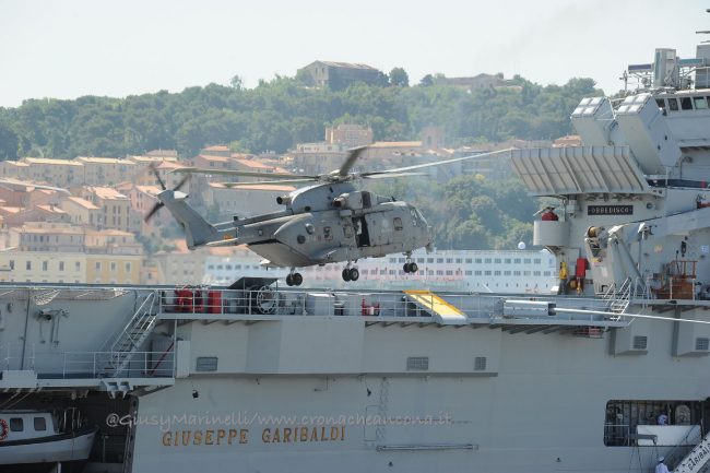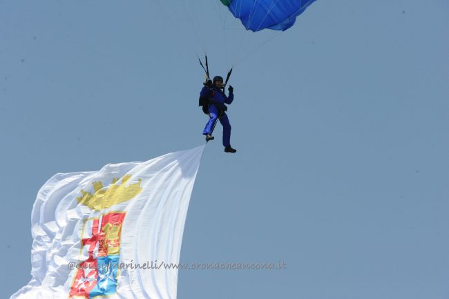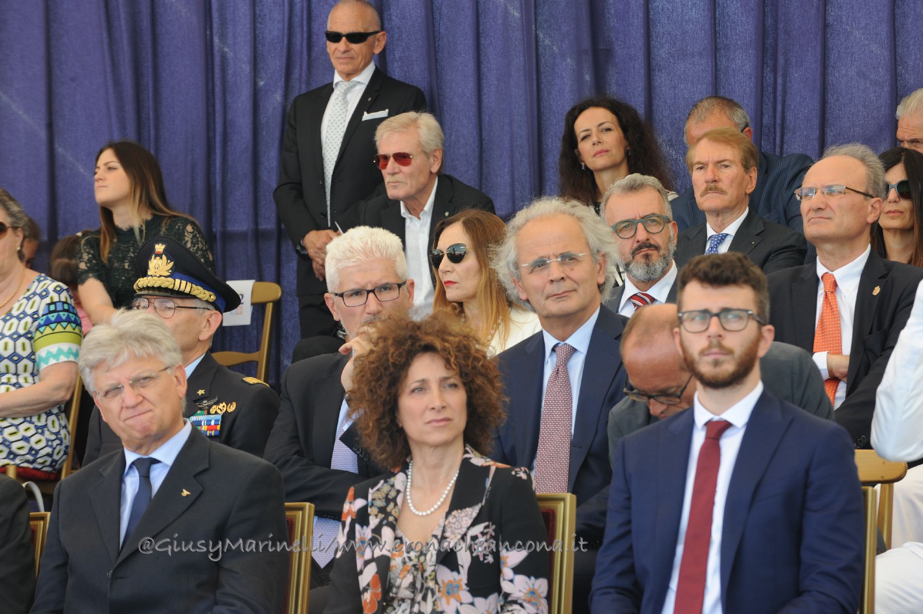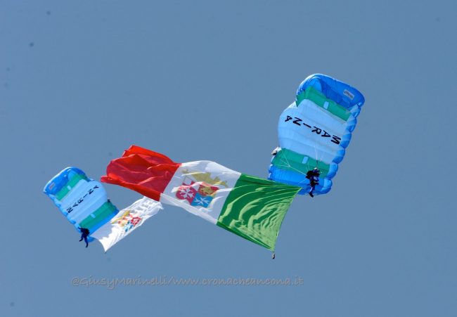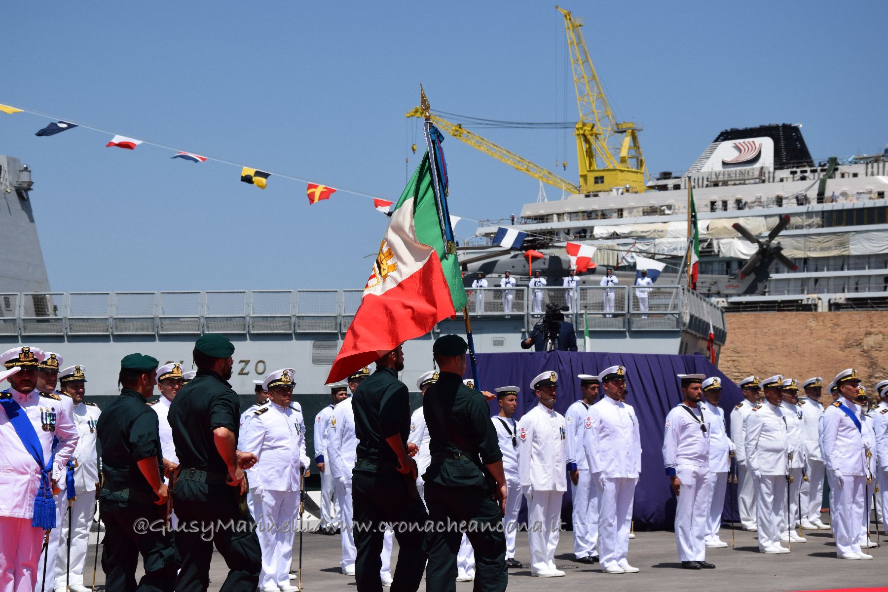 Contemporaneamente all’arrivo del ministro, accompagnata dal capo di stato maggiore della Marina e dal capo di stato maggiore della Difesa, i cieli sono stati teatro dell’esibizione di tre Av-8b della Marina, tre aerei a decollo corto e atterraggio verticale. Un colpo d’occhio eccezionale, poi, è stato dato dall’atterraggio in acqua, tra uno dei sommergibili e la Rizzo, di quattro paracadutisti che hanno mostrato le bandiere della Marina Militare e dell’Italia, con tanto di fumogeni bianchi, verdi e rossi.
