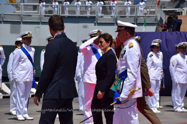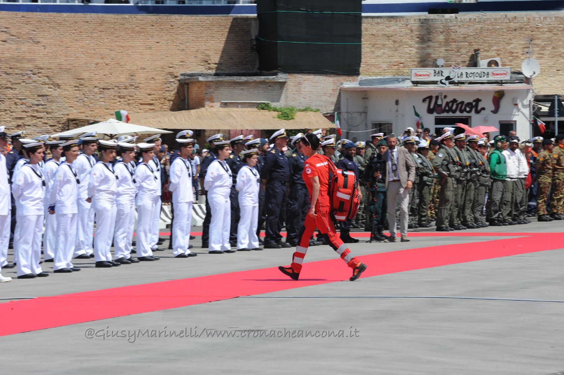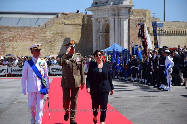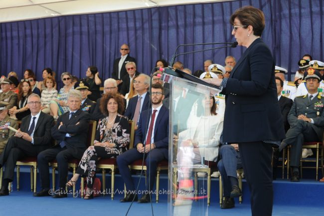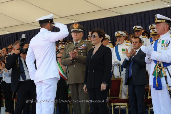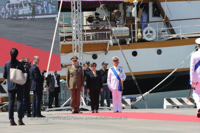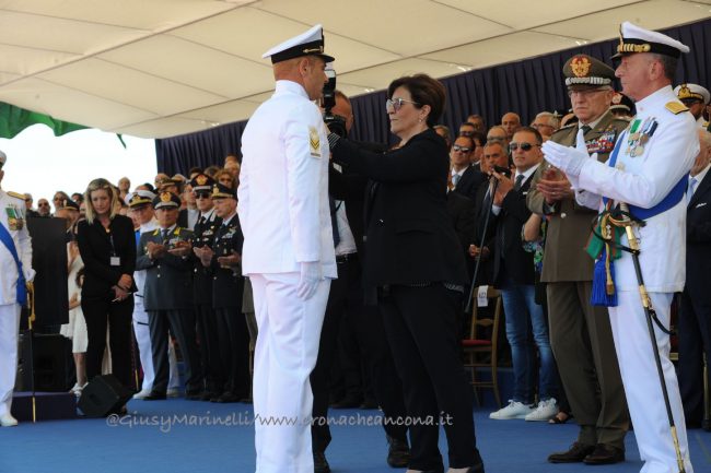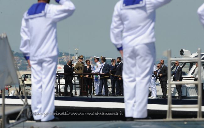 “Mi attiverò con ogni mezzo e attraverso ogni canale per avanzare la proposta di candidatura della Marina Militare e di tutte le componenti che hanno partecipato ai salvataggi al premio Nobel per la Pace. Ve lo meritate e ce lo meritiamo”. La promessa è di quelle che pesano. È la promessa che oggi ha risuonato al porto antico attraverso le parole del ministro della Difesa Elisabetta Trenta, arrivata nel capoluogo dorico in occasione delle celebrazioni per la festa della Marina e del centenario dell’impresa di Premuda per mano del capitano Luigi Rizzo, a cui è dedicato il molo che oggi ha ospitato le rappresentanze dei vari corpi della Marina e un cerimoniale che ha richiamato di fronte all’arco Clementino centinaia di persone. Nei giorni in cui imperversa la polemica per la decisione del ministro Salvini di chiudere i porti italiani all’attracco delle navi Ong che recuperano migranti in mare, fanno discutere le parole del ministro Trenta in visita nello scalo di Ancona. Il ministro ha toccato il porto anconetano poco prima delle 11 a bordo della nave Galatea. Poi, con una pilotina ha passato in rassegna ogni imbarcazione della Marina ormeggiata da giorni al molo Rizzo: dalla Crotone, alla Pedretti, passando per la portaerei Garibaldi, la nave scuola Palinuro, la Rizzo e i due sommergibili, la Venuti e la Romei. Toccata terra, ha salutato gli schieramenti e si è posizionata sulla tribuna colma di autorità civili, militari e religiose.