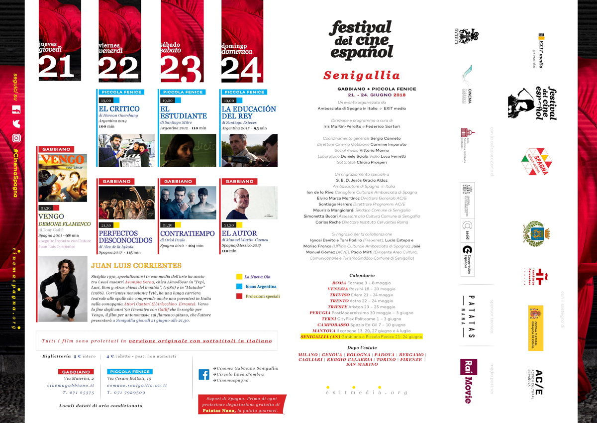 Dopo aver celebrato a Roma la sua undicesima edizione lo scorso maggio, il Festival del cinema spagnolo si trasforma come ogni anno in manifestazione itinerante e dal 21 al 24 giugno tornerà a Senigallia. Ospite d’onore sarà l’attore e musicista Juan Luis Corrienes, che giovedì 21, alle ore 21, presenterà “Vengo” di Tony Gatlif al cinema Gabbiano, unanimemente considerato il film per eccellenza sul flamenco. Gli altri film in selezione sono la crema dell’ultima stagione spagnola: “Perfectos desconocidos”, il remake del campione di incassi “Perfetti Sconosciuti” di Paolo Genovese, firmato da uno dei maestri del cinema europeo quale è Alex de la Iglesia; l’opera seconda di Oriol Paulo, “Contratiempo”, thriller ad alto voltaggio che racconta la vicenda di un giovane uomo d’affari che si sveglia in albergo con il cadavere della propria ragazza, con la porta chiusa da dentro e viene accusato di omicidio; “El Autor” di Manuel Martín-Cuenca, vincitore di due premi Goya per gli attori Javier Gutiérrez e Adelfa Calvo e Premio Fipresci alla prima mondiale al Festival di Toronto 2017, adattamento del romanzo El móvil di Javier Cercas.