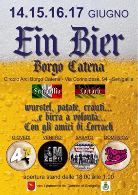 Con “Ein Bier”, dal 14 al 17 giugno, a Borgo Catena torna l’allegra atmosfera della tradizionale Festa della Birra. Organizzata dal locale circolo Arci-Uisp, in collaborazione con i rappresentanti della comunità gemellata di Lörrach e con il patrocinio del Comune di Senigallia, la manifestazione rappresenta un vero e proprio ritorno di uno dei più popolari eventi cittadini. Ricco come sempre il programma, con gli stand che resteranno aperti tutti i giorni dalle ore 18 all’una per servire wurstel, carni affumicate, patate, crauti e birra. Le serate vedranno musica dal vivo: dai classici del rock anni settanta con i “4×70” (giovedì 14) ai successi pop degli anni ottanta con i “Km Zero” (venerdì 15), per arrivare al tributo al Boss con la Bruce Springsteen & the E-street band Tribute (sabato 16) e al rock live dei “Donut Cross” (domenica 17). “Un evento bello – afferma il sindaco Maurizio Mangialardi – ben pensato, ben gestito e dal carattere genuino, che permette di rafforzare i già solidi rapporti con i nostri amici gemellati di Lörrach attraverso un momento di festa e convivialità. Di questo ringrazio il circolo Arci-Usip di Borgo Catena e, ovviamente, Monica Grimmer e tutti i nostri amici tedeschi”.