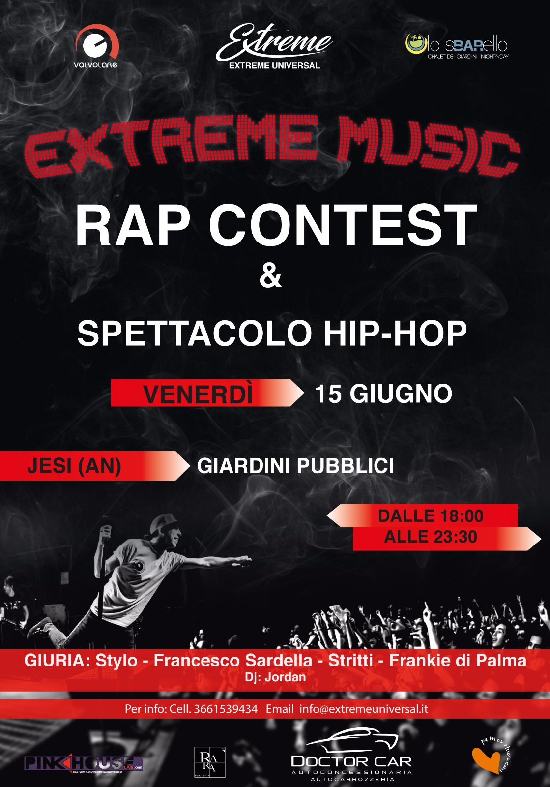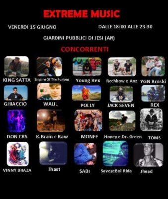 Domani sera, venerdì 15 giugno, rap contest & spettacolo hip-hop e beatbox ai giardini pubblici di Jesi. All’interno della programmazione di “Jesi Music Festival”, curata da “lo sBARello” di Matteo Montesi, la prima edizione di “Extreme Music” con 20 concorrenti e una giuria con nomi di punta: Stylo, Francesco Sardella, Stritti e Frankie di Palma. L’organizzazione è a cura di Extreme Universal, lo sBARello e Valvolare. Inizio ore 18. “Un contest – fa sapere una nota degli organizzatori – che mira a far conoscere i talenti del mondo rap. Tra gli iscritti non solo marchigiani: concorrenti da tutta Italia. Parallelamente al contest anche spettacoli di hip-hop e beatbox. Con questo evento debutta ufficialmente la Extreme Universal, un team di ventenni del territorio che puntano ad esprimere tutto ciò che rende liberi, come arte e musica. A breve nascerà un’etichetta discografica per andare incontro alle esigenze dei giovani nel campo della musica con videoclip, registrazioni, basi musicali, set fotografico», spiegano Ulises Vazquez e Luca Pellegrini, fondatori della Extreme Universal e ideatori di Extreme Music”.