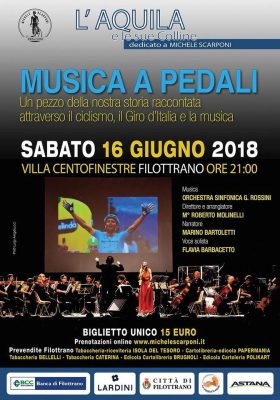‘Musica a pedali’ è un concerto che racconta, con parole e musica, la storia dei primi 100 anni del Giro D’Italia. Un concerto che ha raccolto il consenso di pubblico e critica negli spettacoli già svolti della tournee che vede protagonisti il giornalista sportivo Marino Bartoletti, con il direttore d’orchestra pesarese, compositore e violista Roberto Molinelli. L’appuntamento di domani sera a Villa Settefinestre di Filottrano. organizzato dalla Fondazione Michele Scarponi, vuole essere un omaggio al grande campione del ciclismo italiano, scomparso nel 2017 in un tragico incidente stradale. “Cari amici marchigiani (e non) – scrive sui social media lo stesso maestro Roberto Molinelli – il 16 giugno ricorderemo insieme Michele Scarponi nella sua Filottrano, attraverso “Musica a pedali”, il nostro Giro d’Italia, unendo lo sport alla musica. L’elegante, simpatico e carismatico mattatore Marino Bartoletti, del quale mi onoro di essere amico, e la bravissima e duttilissima Flavia Barbacetto saranno i solisti della serata, accompagnati dall’Orchestra Sinfonica G.Rossini, diretta dal sottoscritto, che ha firmato anche gli arrangiamenti. In più, il suggestivo teatro naturale di Villa Centofinestre, una lussureggiante radura racchiusa tra verdi alti alberi, è a dir poco sorprendente. Veniteci a trovare a Filottrano. Vi aspettiamo”. Il biglietti d’ingresso è unico e costa 15 euro.