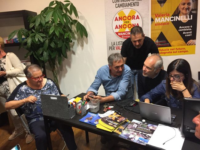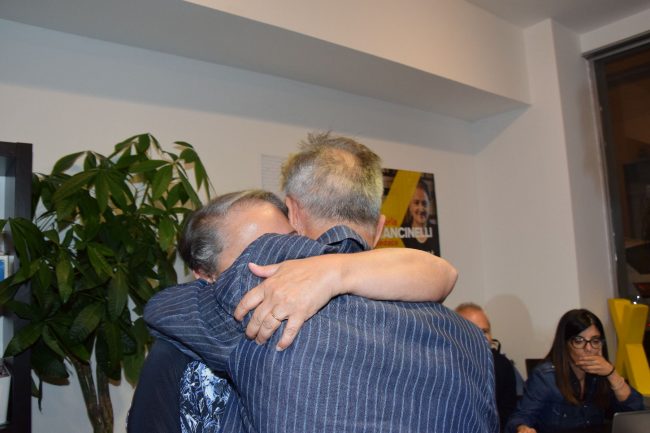 A mezzanotte, con la vittoria in tasca, Valeria Mancinelli sale a Palazzo del Popolo e ci rientra con la certezza di essere il sindaco dei prossimi cinque anni. Il dato definitivo arriverà poco più tardi, a pochi minuti dall’una di notte: il sindaco si riconferma con il 62,78% con 21.152 voti contro il 37,2%, i 12.541 elettori di Stefano Tombolini. Risultati praticamente immutati rispetto al primo turno, dove Mancinelli aveva ottenuto 20.738 preferenze contro i 12.308 elettori di Tombolini. “Vinciamo con oltre il 60% perché qui la politica ha fatto ciò che dovrebbe fare: si è preoccupata dei problemi della città e delle possibili soluzioni. Non è un risultato solo del Pd, il Pd è stato il perno di una coalizione uscente che ha dato l’impressione e non solo alla città di occuparsi dei problemi reali, di fare una politica utile, di fare il suo mestiere”. Le prime parole del sindaco rimarcano il lavoro svolto in questi primi cinque anni e si inseriscono nel solco della continuità con il primo mandato. “Ora? Portiamo a compimento i 5-6 progetti strategici di cui abbiamo già vinto i finanziamenti tramite bandi nazionali e europei, a iniziare dagli Archi. Altra priorità è aumentare l’impegno nelle manutenzioni ordinarie”. L’affluenza drammatica al 42,6%? “Fa parte del meccanismo del ballottaggio, quando restano solo due candidati a confrontarsi, molti scelgono di non votare per l’uno o per l’altro” taglia corto il sindaco. Con Mancinelli arrivano direttamente dal comitato elettorale della galleria dorica tanti esponenti del governo uscente, dagli assessori come Simonella, Borini, Manarini, Fiorillo, Guidotti e Marasca, ai consiglieri comunali Pistelli, Mazzeo, Dini, fino al segretario del Pd Cardoni. L’abbraccio più forte è con uno dei consiglieri comunali del Pd che più è stato critico in questi anni, Massimo Mandarano. Quando arriva il dato definitivo, tutto l’entourage esplode nell’applauso, nell’urlo