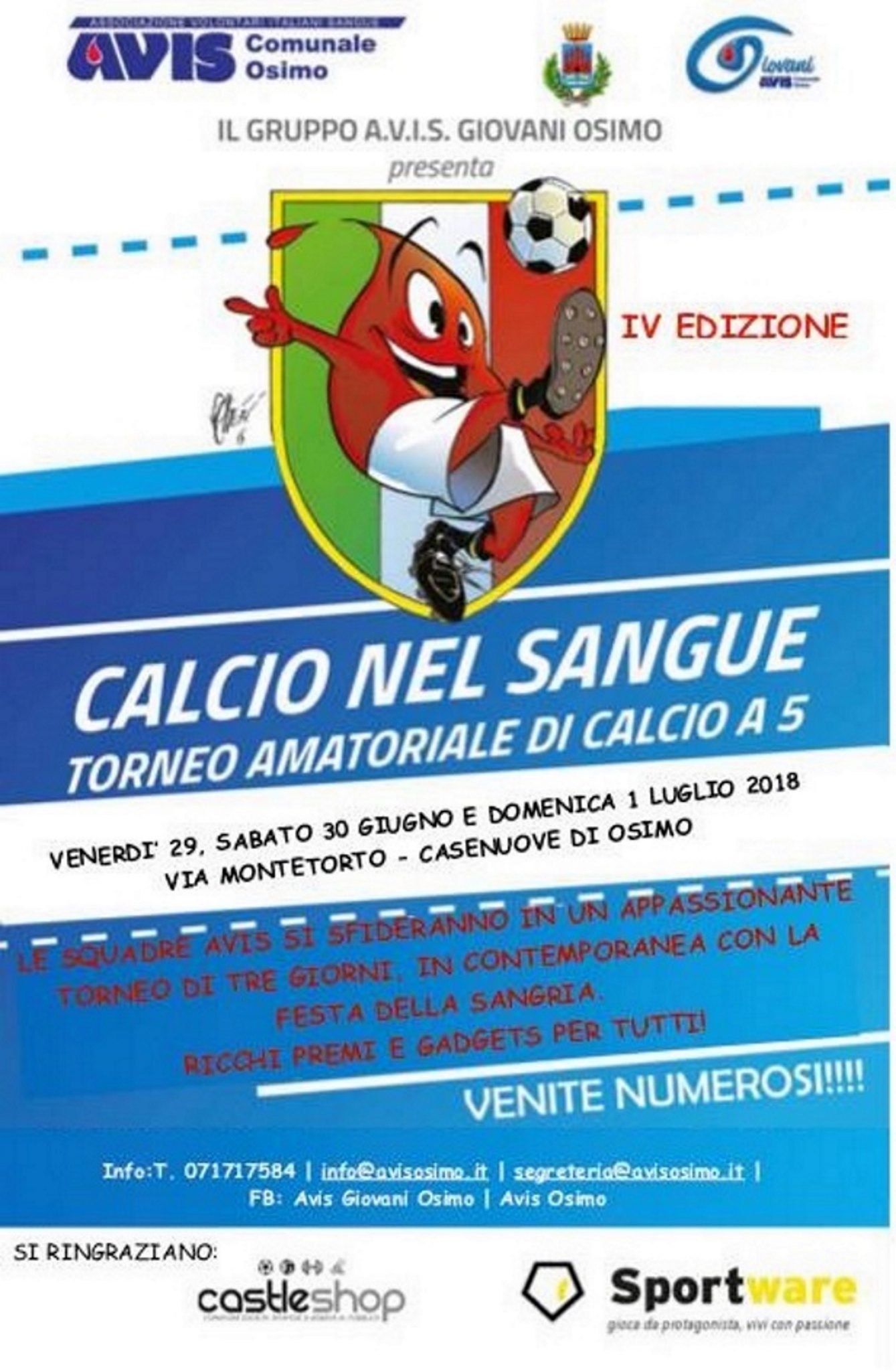 Sport e Avis ancora a braccetto. Dopo il successo delle passate edizioni torna “CalcioNelSangue”, il torneo tutto avisino, giunto alla 4° edizione che vede sfidarsi le squadre dell’associazione in un quasi “mondiale” di calcio a 5. Organizzato dall’Avis Osimo, l’evento si svolge dal 29 Giugno al 1 Luglio in concomitanza con la Festa della Sangria a Casenuove. Diverse conferme, i padroni di casa osimani, l’Avis Castelfidardo, l’Avis Polverigi e l’Avis Camerano campione in carica, a cui si aggiunge il ritorno dell’Avis Filottrano, mancava dalla prima edizione, e la “new entry” Avis Agugliano. “Si comincia venerdì 29 con il girone A, con Avis Osimo, Polverigi e Agugliano, – fa sapere una nota dell’associazione di volontariato – mentre sabato 30 spazio al girone B, con Avis Filottrano, Castelfidardo e Camerano, mentre domenica 1 Luglio via alle finali per 3° – 4° posto e finalissima. I gironi sono di sola andata mentre tutte le partite sono da 40 minuti ed inizieranno alle ore 20.00. La novità di quest’anno è che le squadre saranno miste, per dare un tocco “rosa” alla competizione, mentre l’Avis Osimo ci sarà per tutte e tre le sere anche con il gazebo con i gadgets estivi, cappelli, cuffie da piscina e cuscini da mare, tanti palloncini ed i volontari dell’associazione pronti a dare informazioni sull’importante tematica della donazione di sangue e organi”.