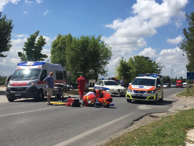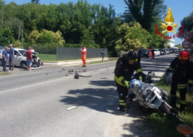 Auto contro moto sulla SS 76, nel tratto jesino, che corre davanti alla casa del commiato Santarelli. Lo scontro tra i due mezzi è avvenuto verso le ore 11.15 di stamattina e sul posto, per portare i primi soccorsi ai feriti, stanno operando una squadra dei vigili del fuoco di Jesi, una pattuglia della Polizia locale e un’ambulanza della Croce Rossa in servizio di 118. Il centauro è stato trasportato in codice rosso al pronto soccorso dell’ospedale di Torrette. Il traffico ha subito rallentamenti.