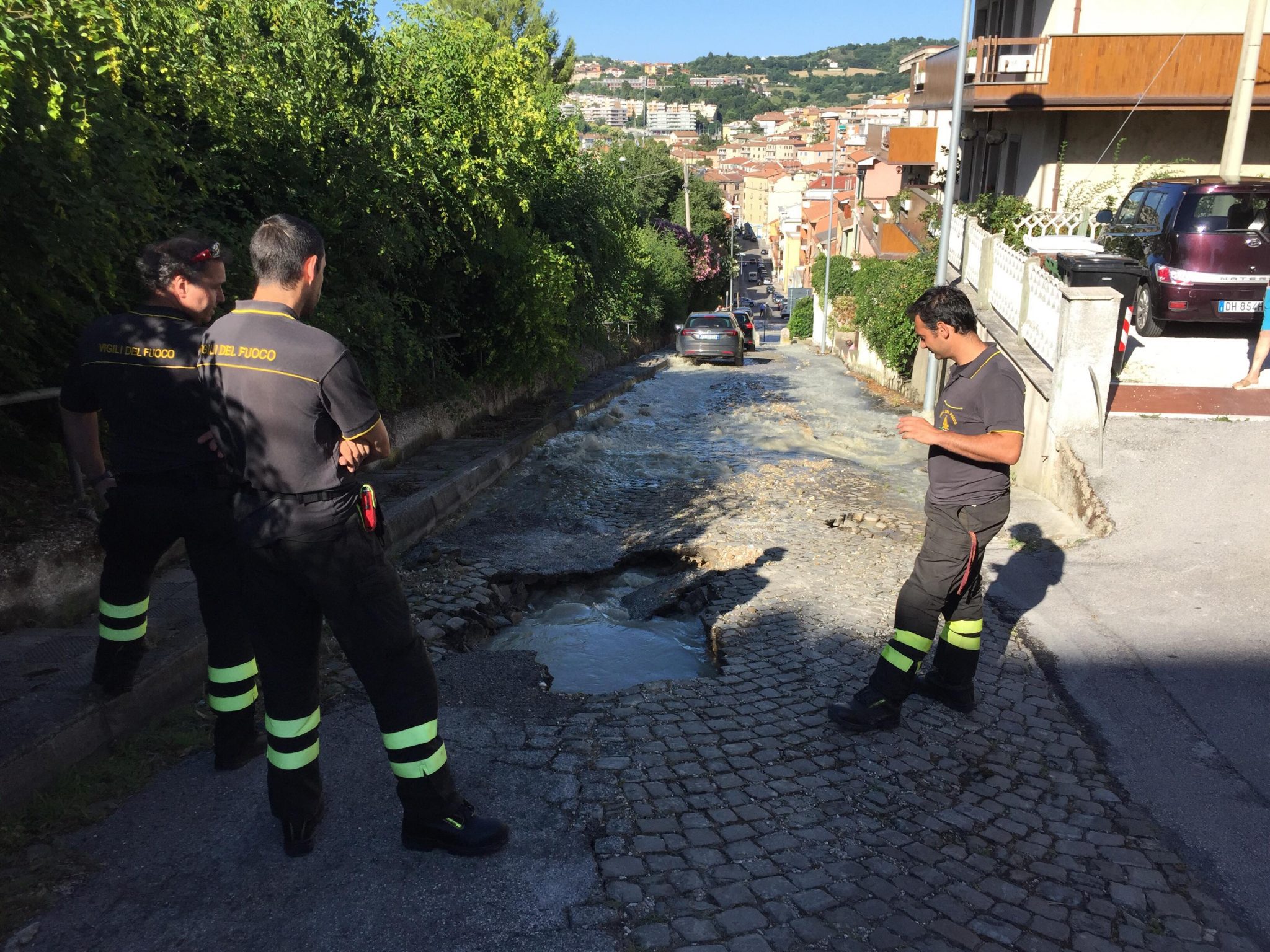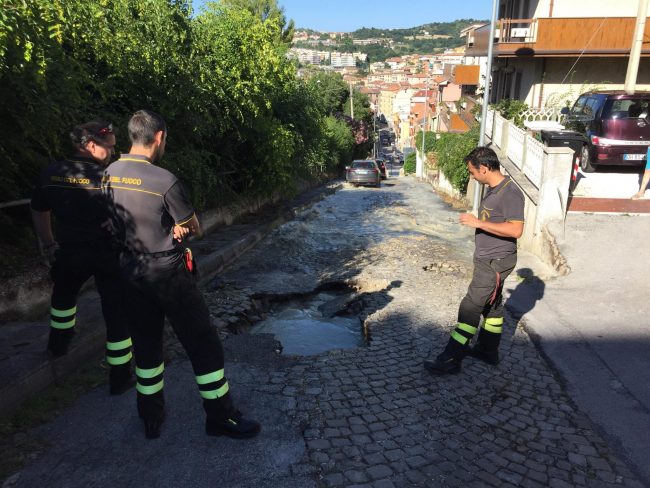 Scoppia una tubatura in via scrima, salta l’asfalto, strada allagata e chiusa al traffico e famiglie a secco. È successo poco fa in via Scrima ad Ancona. Al lavoro i tecnici di Multiservizi per riparare il guasto e stoppare la fuoriuscita di acqua, chiudendo una valvola, prima di intervenire sulla tubatura “impazzita”. Al lavoro anche i vigili del fuoco. L’operazione che si sta rivelando più complicata del previsto mentre tutte le famiglie della zona sono rimaste a secco. Intanto la polizia municipale ha chiuso il tratto di via senza sbocco, dalla parte delle Pie Venerini. Ma ad essere interdetto al traffico anche il tratto di via Scrima in salita dall’altezza del negozio Acqua e Sapone per motivi di sicurezza. La forza dell’esplosione del tubo a squarciato il selciato della strada ed il torrente di acqua ha trascinato anche con sé fango e detriti pericolosi per chi è alla guida. Chiusa momentaneamente anche via Pesaro. L’intervento dei tecnici è riuscito a ripristinare l’acqua corrente in alcune case, ma sono ancora molte le famiglie rimaste senz’acqua. Si sta lavorando affinché in tutta la zona possa essere al più presto ripristinata la fornitura, ma ci vorranno ancora diverse ore.