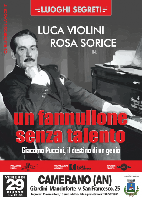 A Camerano, venerdì 29 giugno alle ore 21.30, presso i Giardini di Villa Mancinforte, il doppiatore Luca Violini ed il soprano Rosa Sorice, accompagnata al pianoforte da Davide Caprari, porteranno in scena, in anteprima nazionale, lo spettacolo di RadioTeatro “Un fannullone senza talento. Giacomo Puccini, il destino di un genio”. La consulenza letteraria è di Paolo Logli ed il disegno del suono di Riccardo Favi. Un “falento” così veniva definito dallo zio Giacomo Puccini, giovane rampollo di quattro generazioni di musicisti di cappella.