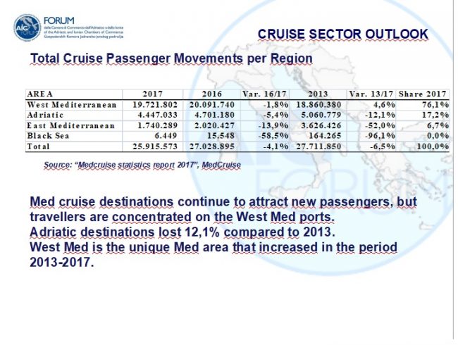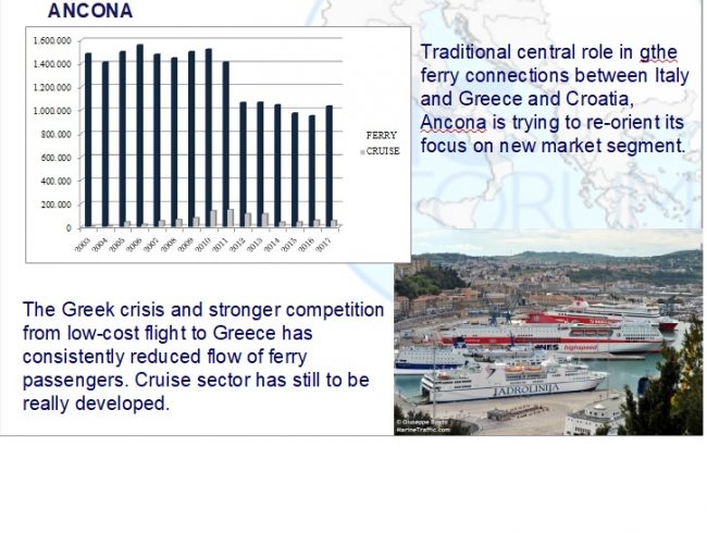 Con i suoi 60mila crocieristi circa, il porto e la città di Ancona non riescono ad entrare nella top ten delle mete del Mediterraneo, per quanto riguardo lo specifico settore, rimanendo ancora sostanzialmente un porto che si caratterizza soprattutto per il traffico passeggeri. Ancona rientra invece per un soffio, in ultima posizione davanti a Ravenna e Fiume, nei primi dieci porti per traffico crocieristico dell’Adriatico, dove continua a farla da padrone Venezia, unica città dell’Adriatico e dello Ionio ad entrare nelle prime dieci destinazioni del traffico crociere, quinta dopo Barcellona, Civitavecchia, Palma di Maiorca e Marsiglia. I flussi turistici si concentrano su scali attivi solo nel segmento passeggeri (Kotor, Corfù e Katakolon).