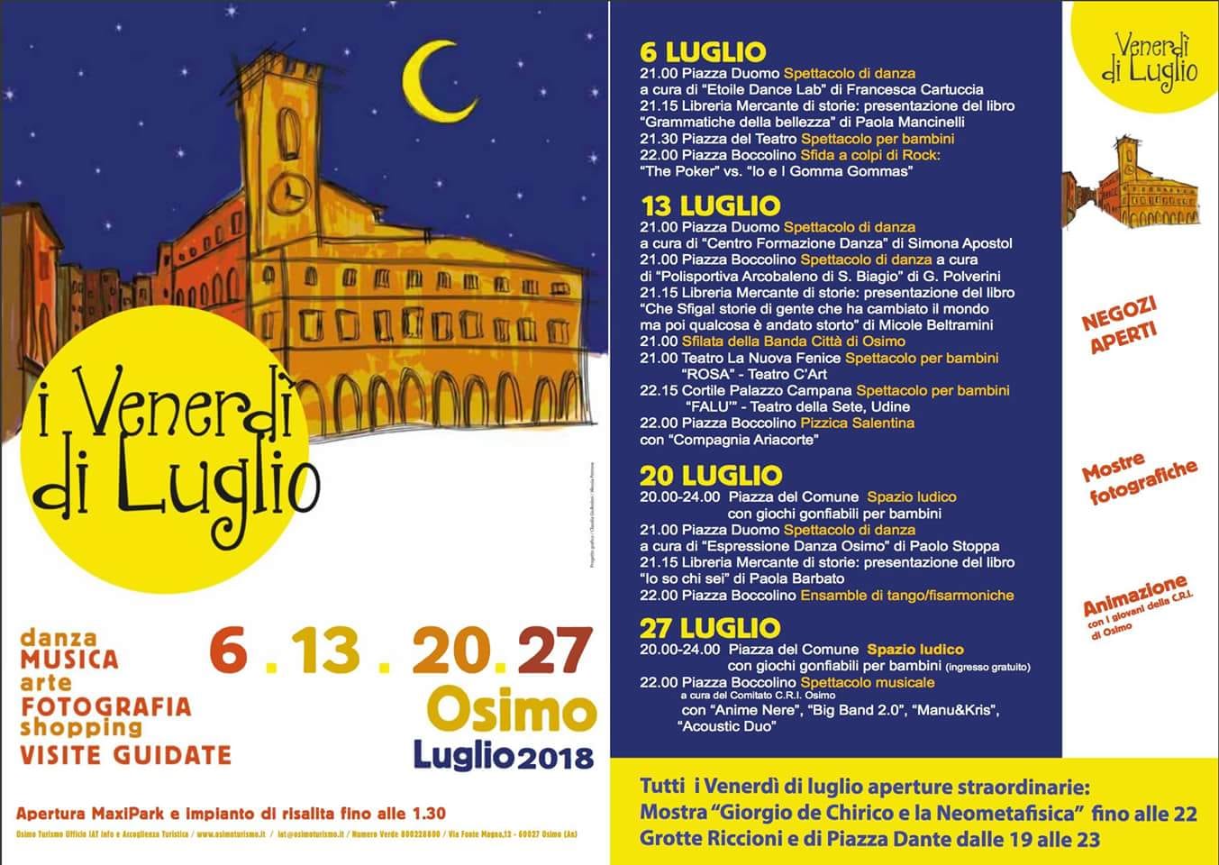Quattro venerdì sera di musica, storie da raccontare, danze, spettacoli, la mostra di De Chirico da visitare, percorsi urbani e sotterranei nelle grotte e shopping sotto le stelle per ‘Osimo Estate 2018’. Il cartellone culturale per la bella stagione si apre venerdì prossimo, 6 luglio per animare i dopocena di osimani e turisti. Il primo appuntamento coinciderà con la notte dei saldi che nelle Marche prenderanno il via il 7 luglio per terminare il 1 settembre. Ma  quella sera sono in programma anche spettacoli teatrali per bambini in piazza Marconi e sfide all’ultima nota tra rock band sul palco di piazza Boccolini tra i The Poker e i Io e i Gomma Gommas.  Contemporaneamente alla Libreria Il Mercante di Storie andrà in scena lo spettacolo di lettura ‘Grammatiche della bellezza’ con la presentazione dell’ultimo libro di Paola Mancinelli.