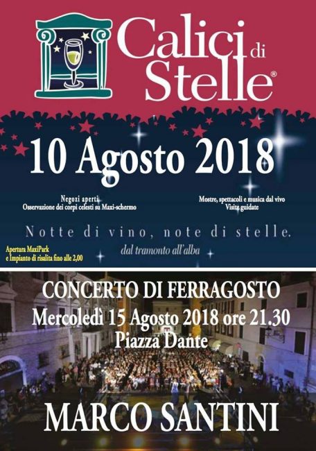 EVENTI - Nel cartellone degli eventi 2018 sono stati confermati i 'Venerdì di Luglio, Calici di Stelle nella notte di San Lorenzo ed il Concerto di Ferragosto sul palco di piazza Dante liberata dalle auto