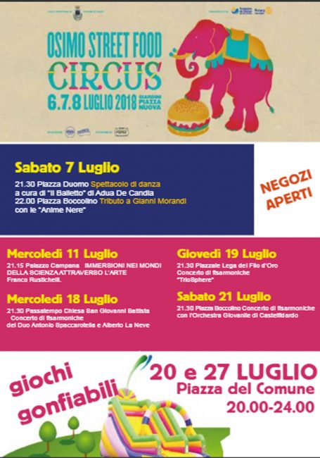 Si replica il 13, il 20 ed il 27 luglio con nuove proposte culturali e di divertimento. La musica sarà anche il filo conduttore di due eventi della tradizione estiva di Osimo, Calici di Stelle, in programma per il prossimo 10 agosto e del Concerto di Ferragosto, entrambi riconfermati. Il 15 agosto, in particolare, piazza Dante, liberata dalle auto, si trasformerà in una grande palcoscenico tra le sonorità orchestrate dal maestro Marco Santini. Per tutte le date inserite nel cartellone degli eventi di ‘Osimo Estate’ i negozi del centro storico resteranno aperti fino a mezzanotte come il maxi parcheggio e l’impianto di risalita (nella Notte di San Lorenzo il Tiramisù chiuderà alle 2). A luglio sono previsti inoltre 5 appuntamenti con Osimo Street Food, con l’area giochi gonfiabili per bambini, Tutte le iniziative sono state organizzate dal Comune di Osimo in tandem con l’azienda speciale Asso ed in collaborazione con i commercianti del salotto cittadino.