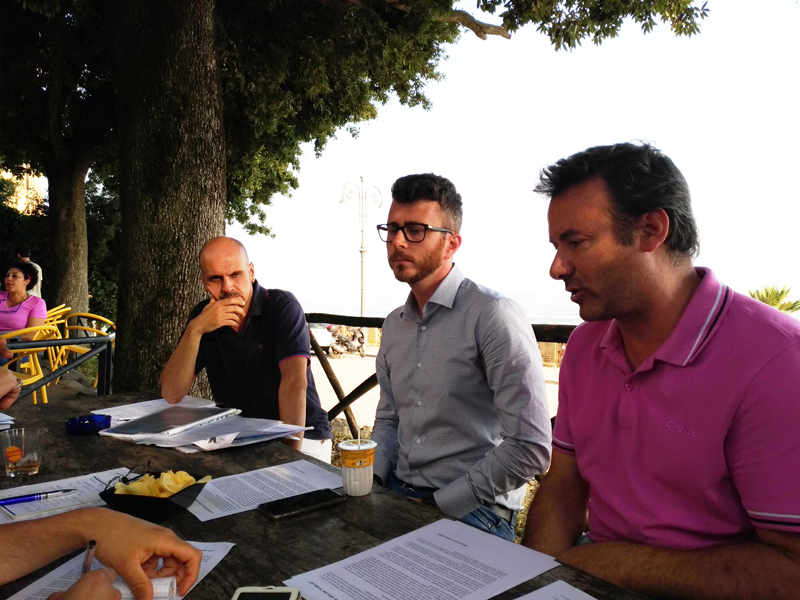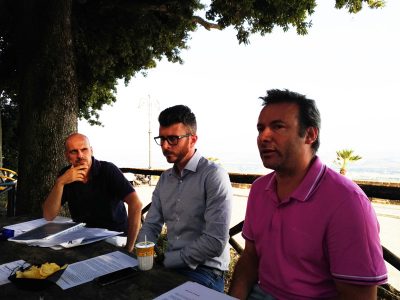 Un momento della conferenza stampa organizzata ieri pomeriggio dal M5S Osimo a Piazza Nuova. Da sin. Mauro Bugari, Paolo Giuliodori e David Monticelli