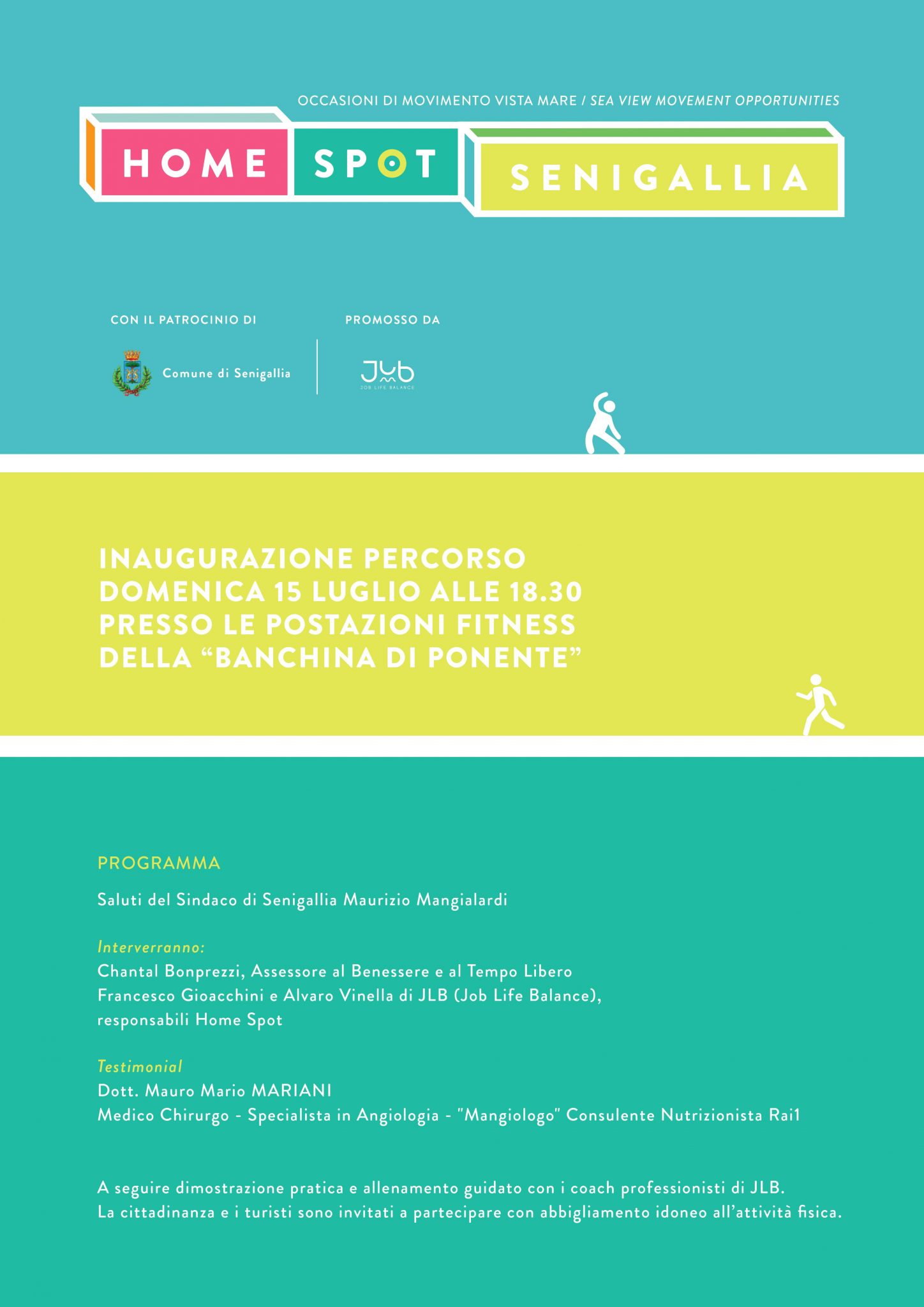 Un nuovo modo di intendere il movimento. Senigallia si prepara a far vivere a cittadini e turisti un’esperienza di benessere a 360°. Sarà inaugurato domenica 15 luglio, alle 18,30 presso la banchina di ponente, Home Spot – occasioni di movimento vista mare, il primo percorso digitale e multisensoriale a contatto con la natura. A svelare i cartelli insieme al sindaco di Senigallia Maurizio Mangialardi e all’assessore alle Politiche del benessere Chantal Bomprezzi, un testimonial d’eccezione: direttamente da Linea Bianca, il dott. Mauro Mario Mariani, “Mangiologo” Consulente Nutrizionista Rai Uno. Ideato da Job Life Balance, società leader nel settore del lifestyle, Home Spot è patrocinato dal Comune di Senigallia. Il percorso è stato pensato come una palestra sul mare: 3,7 km dalla banchina di ponente al lungomare di levante utilizzando le cinque postazioni fitness già presenti. Le proposte di movimento sono realizzate dai professionisti JLB e sono costantemente aggiornate attraverso QrCode. Home Spot prevede anche eventi e attività a tema per coinvolgere persone di tutte le età. Inoltre, sui principali social (Facebook, Instagram e YouTube) ogni giorno video, foto e consigli sul lifestyle a cura degli esperti JLB. Gli spot tengono conto dei panorami e dell’arredo urbano e rappresentano un’occasione di movimento per tutti, cittadini e i turisti, in ogni istante della giornata, tutto l’anno.