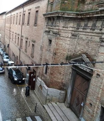 Lì’ingresso sul retro dell’ospedale Ss Benvenuto e Rocco e della sua chiesa, durante l’acquazzone di oggi