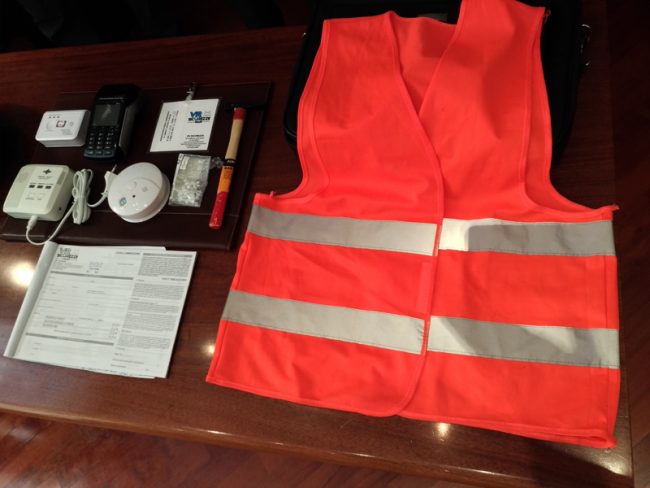 Il rilevatore del gas, il tesserino, la pettorina martello e chiodi sequestrati con l’elendo dei potenziali clienti-vittima al 41enne di Brescia