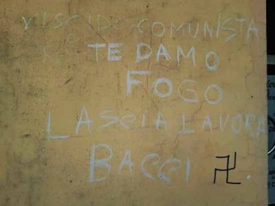 Scritte minatorie sono comparse nei giorni scorsi sul muro di un palazzo in piazza Pergolesi. Scritte fatte con un gessetto bianco e accompagnate da una svastica (fatta al rovescio) in pennarello nero. “Viscido comunista te damo fogo lascia lavora Bacci” è il contenuto del messaggio, comparso proprio di fronte alla Galleria d’arte 2G di Andrea Barchiesi. Un messaggio che non è certo passato inosservato e che desta rammarico nel titolare della sede espositiva jesina. “Al di là di chi è con o contro Bacci, a favore o contrario ai lavori che sta facendo questa amministrazione in una piazza meravigliosa come quella dedicata a Pergolesi – dice Barchiesi – questa scritta mi rammarica soltanto, perché grazie alla mia Galleria ho donato moltissime opere alla Pinacoteca civica e al museo di Palazzo Bisaccioni, mai mi sarei aspettato un trattamento così. Queste scritte mi danno fastidio, mi offendono ma certamente non mi spaventano”. Nella zona non vi sono telecamere, per cui anche se il titolare del palazzo storico decidesse di sporgere denuncia contro ignoti, non sarebbe facile individuare i responsabili.