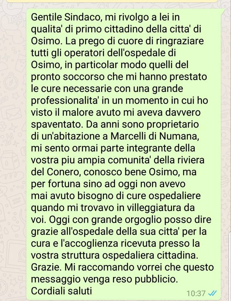 Il messaggio di ringraziamento per i medici del pronto soccorso del Ss. Benvenuto e Rocco inviato al sindaco di Osimo