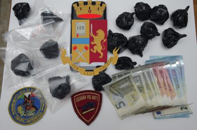 I Poliziotti delle Volanti si sono avvicinati e l’uomo, appena accortosi di essere circondato ha tentato di eludere il controllo sedendosi su una panchina che stava davanti alla siepe, e fischiettando un motivetto. Gli agenti allora hanno proceduto a un controllo e hanno trovato il piccolo involucro nella tasca del pantaloncino, che conteneva una piccola quantità di marijuana. Immediatamente hanno fatto intervenire il cane antidroga Wally per un più accurato controllo alla siepe e al fogliame. Il cane Poliziotto ha scovato, ben nascosto tra la vegetazione un altro involucro termosaldato di colore scuro contenente 14 sacchettini di cellophane nero, tutti ben chiusi ,con all’interno marijuana del peso complessivo di oltre 53 grammi. Il giovane di 23 anni, con precedenti specifici,è stato condotto in questura e arrestato per detenzione ai fini di spaccio di sostanza stupefacente e posto a disposizione dell’Autorità Giudiziaria. Tutta la sostanza stupefacente veniva sequestrata.