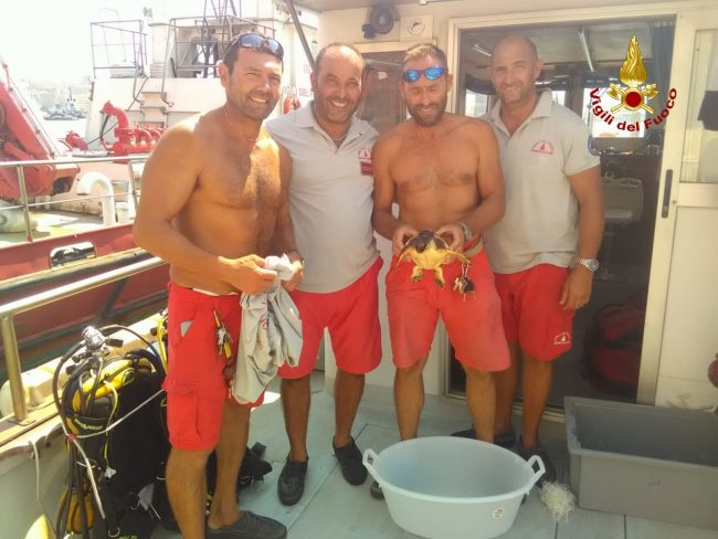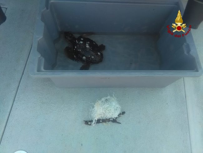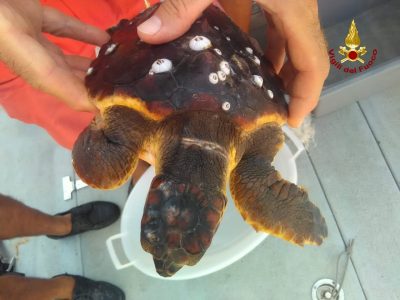 Il soccorso è avvenuto questo mattina attorno alle 11.30 nella antistante il porto di Ancona. La squadra dei sommozzatori era stata chiamata per la rimozione di un tronco. All’arrivo sul posto i vigili del fuoco hanno subito notato che attorno al tronco c’era una tartaruga marina impigliata in una rete. Si è proceduto a liberare l’animale ferito e legare il tronco per il trasporto in banchina. La tartaruga è stata consegnata al personale del Centro recupero cetacei di Riccione.
