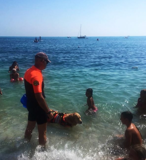 Simulazione di salvataggio in mare di persone in pericolo di annegamento, stamattina a ‘La Spiaggiola’ di Numana con un ‘angelo del mare’ in azione. Protagonisti il cane Nina, baywatch a quattro zampe, ed il suo conduttore, una delle oltre 300 Unità Cinofile volontarie presenti sulle coste italiane, certificate dal brevetto della Scuola Italiana Cani Salvataggio (Sics) . “Salvano vite umane. Un applauso a Nina della Scuola Italiana Cani Salvataggio che questa mattina ci ha regalato una splendida dimostrazione di salvataggio in mare” ha commentato sui social media il gestore dell’hotel-ristorante con stabilimento balneare.