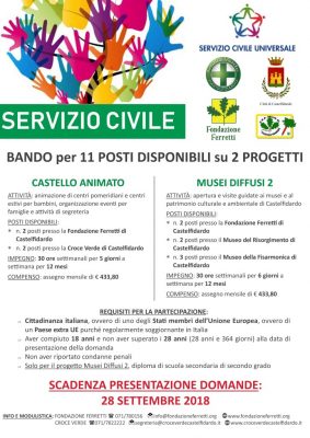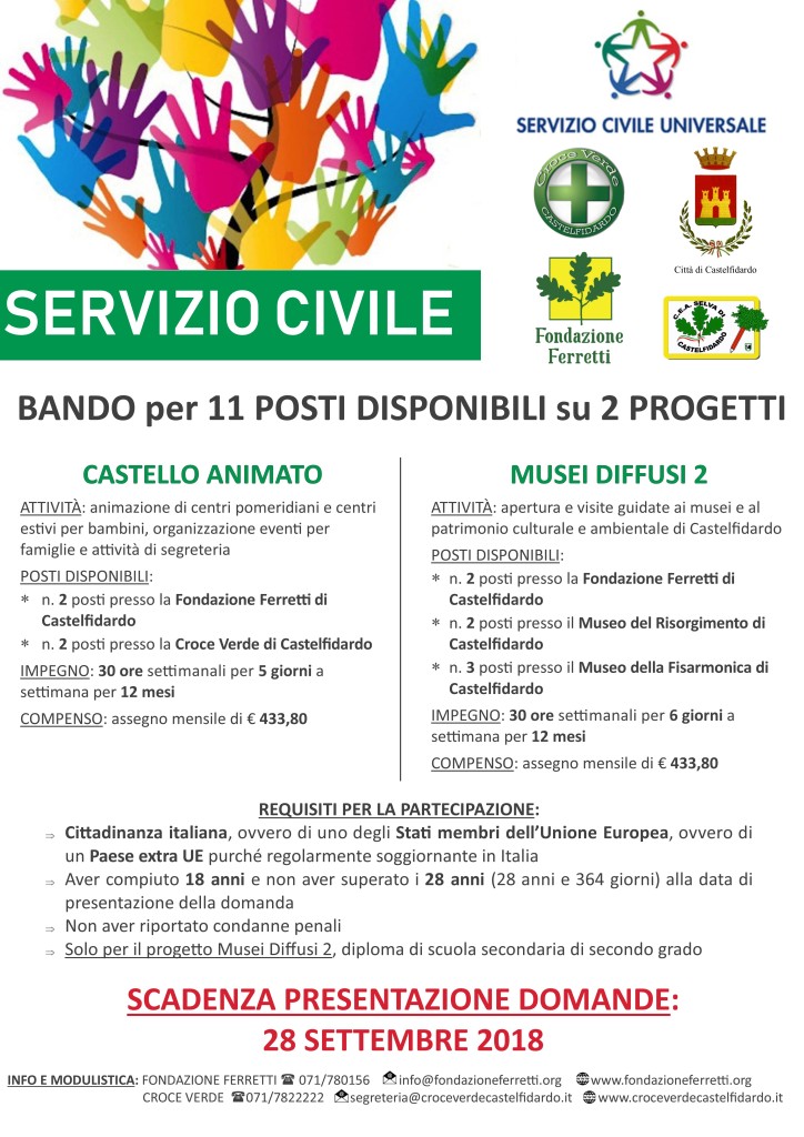 Ulteriore requisito solo per l`ammissione al progetto “Musei diffusi 2” è il possesso del diploma di scuola secondaria di secondo grado. I requisiti di partecipazione devono essere posseduti alla data di presentazione della domanda e, ad eccezione del limite di età, mantenuti sino al termine del servizio.(info: http://www.fondazioneferretti.org/?page_id=3401#v oppure al n. 071/780156 o via email a info@fondazioneferretti.org o sull`apposita pagina di Facebook oppure la Croce Verde al n. 071/7822222 o via email a segreteria@croceverdecastelfidardo.it)