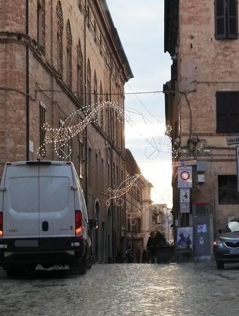 Luminarie delle feste patronali settembrine montate sulle vie del centro storico di Osimo, scatta il conto alla rovescia per i festeggiamenti patronali che culmineranno il 18 con la fiera di San Giuseppe da Copertino e gli eventi in centro.