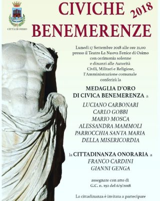 Cinque civiche benemerenze, due cittadinanze onorarie. La cerimonia di consegna dei riconoscimenti civici 2018 collegati alle feste patronali di San Giuseppe da Copertino si terrà lunedì prossimo 17 settembre alle 21, al Teatro La Nuova Fenice di Osimo. Per ora il Comune di Osimo ha reso noto i nomi dei cittadini benemeriti e onorari, ma come è tradizione, ai riconoscimenti più ambiti farà da corollario una serie di premi dedicati alla memoria di chi non c’è più, agli osimani che si sono distinti nel mondo del lavoro e in altre discipline. Quest’anno, quindi, le civiche benemerenze saranno consegnate al medico Luciano Carbonari, direttore della struttura complesso di Chirurgia vascolare degli Ospedali Riuniti di Ancona; a Carlo Gobbi, insegnate in pensione e autore di libri; a Mario Mosca, pittore, incisore e litografo, all’imprenditrice Alessandra Mammoli e alla parrocchia di Santa Maria della Misericordia. La cittadinanza onoraria sarà invece conferita allo storico, saggista e blogger Franco Cardini e a Gianni Genga, direttore generale dell’Inrca di Ancona.