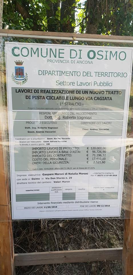 Sono iniziati i lavori del nuovo tratto di collegamento della pista ciclabile di Campocavallo. Ne da notizia il sindaco di Osimo, Simone Pugnaloni. “Si tratta di un percorso di 540 metri che collegherà il parco Verde Energia all’inizio dell’anello “Girardengo”. Con questo intervento – spiega il primo cittadino osimano – metteremo in sicurezza tutti i pedoni che oggi partiti da Campocavallo non dovranno più correre o passeggiare lungo la strada evitando pericolo per la propria incolumita’. Si compie un progetto importante che vede nella zona pista ciclabile di Campocavallo il luogo cardine delle delle passeggiate e del tempo libero all’aria aperta per giovani, famiglie ed anziani. Un percorso che può essere attrazione anche per i turisti che amano l’ambiente ed il paesaggio”.