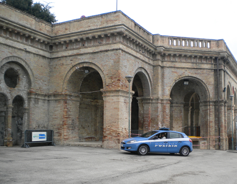 La volante del Commissariato di Osimo davanti al loggiato dell’ex Foro Boario dove era stato soccorso il tossicodipendente in overdose di sostanza stupefacente