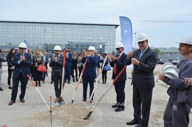 Con caschetto e pala in mano, il presidente dell’Autorità Portuale, Rodolfo Giampieri, e l’assessore regionale Angelo Sciapichetti, che ha fatto le veci del governatore Luca Ceriscioli, hanno aiutato Rivolte, Polacco e Bramucci a coprire la prima pietra, benedetta dal vescovo Spina.