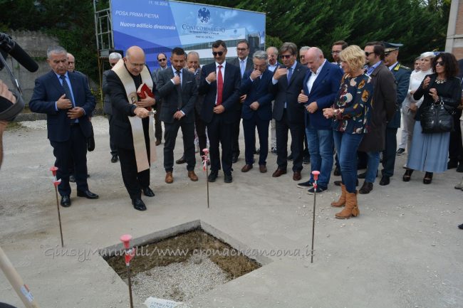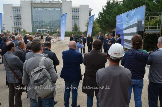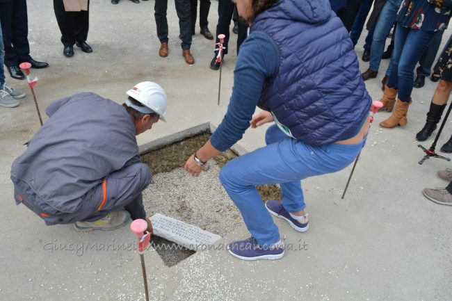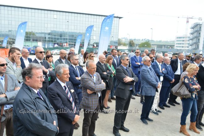 Con caschetto e pala in mano, il presidente dell’Autorità Portuale, Rodolfo Giampieri, e l’assessore regionale Angelo Sciapichetti, che ha fatto le veci del governatore Luca Ceriscioli, hanno aiutato Rivolte, Polacco e Bramucci a coprire la prima pietra, benedetta dal vescovo Spina.