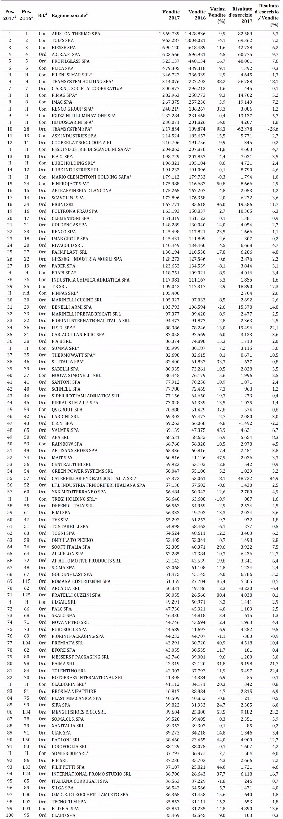 La classifica. Per quanto riguarda la classifica, l’unica impresa a superare il miliardo di euro è la Ariston Thermo, che si conferma al primo posto, registrando nel 2017 una significativa crescita delle vendite (+9,9%). Piccola flessione per la Tod’s, che lo scorso anno è scesa sotto la soglia del miliardo a causa di una leggera flessione nelle vendite (-4,1%). E a proposito della società che fa base a Casette d’Ete, il patron Diego Della Valle ha oggi smentito le voci di una possibile vendita, circolate in seguito alla diffusione di notizie sul riassetto delle holding a monte della società: «Oggi lo chiamano story telling, una volta le chiamavano cazzate − il commento lapidario, e aggiunge −: semmai, compriamo qualcosa». Tra le prime 10 posizioni (tra le quali si tiene conto delle società operative e non delle holding), l’unica variazione di rilievo è costituita dall’entrata all’ultimo gradino delle top ten della TeamSystem, leader in Italia nei software gestionali e nei servizi di formazione con base a Pesaro. Tra il 2016 ed il 2017 ha raddoppiato il valore delle vendite (+98,3%). Scala al 13° posto Bag spa, la società del brand Nero Giardini (-4,4% nelle vendite) di Enrico Bracalente. Nella classifica, dopo Ariston Thermo e Tod’s spa, si piazzano Biesse spa, Acraf spa, Profilglass spa, Elica spa, Carnj società cooperativa, Imac spa, IGuzzini Illuminazione spa e TeamSystem spa. Rilevanti le prestazioni nel 2017 di Finpoject (+50,8%, balzata dal 22°al 14° posto) e Pigini (+96%, dal 32° al 17° posto).