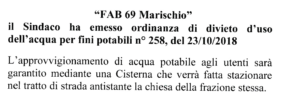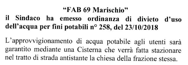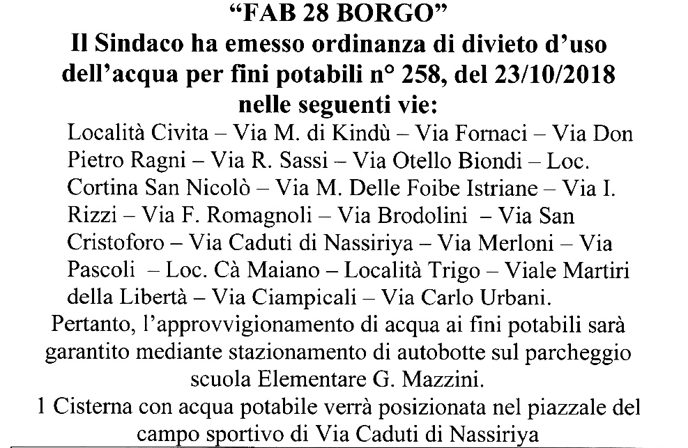 Due linee dell’acquedotto di Fabriano inquinate da batteri Escherichia Coli con valori sopra la soglia di legge. Da oggi pomeriggio è emergenza acqua per diverse famiglie della città della carta. Dopo la comunicazione dell’Asur- Area Vasta 2 preceduta da una telefonata, il sindaco Gabriele Santarelli ha immediatamente emesso una ordinanza che vieta l’ uso potabile e alimentare dell’acqua del rubinetto per 6mila abitanti serviti dalle linee Fab28 del Borgo-viale Martiri di Kindu e Fab69 di Marischio, fino all’esecuzione di nuove analisi che attestino il ripristino della conformità dei parametri. Poi ha inviato copia dell’ordinanza alla Multiservizi S.p.a per sollecitare l’arrivo delle autobotti nel parcheggio della scuola elementare Mazzini e una cisterna nel piazzale del campo sportivo in via Caduti di Nassiriya. E’ la terza volta che l’emergenza si manifesta quest’anno al Borgo.