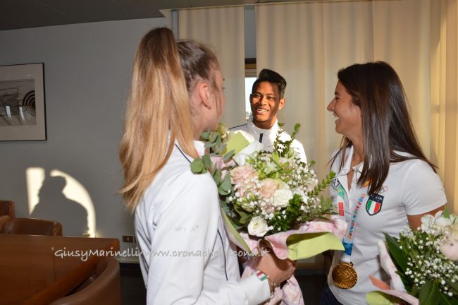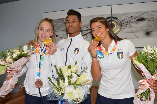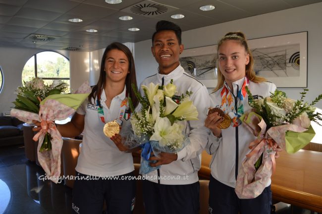 da sinistra la ginnasta medaglia d’oro, Talisa Torretti, il ginnasta Lay Giannini, Giorgia Speciale, campionessa di windsurf