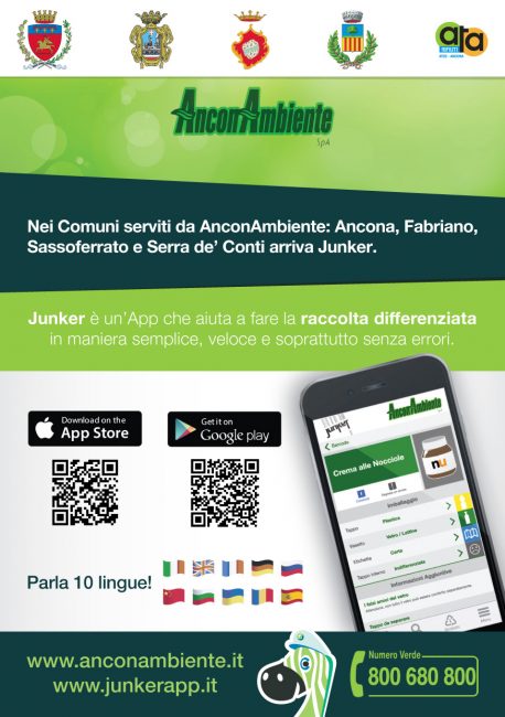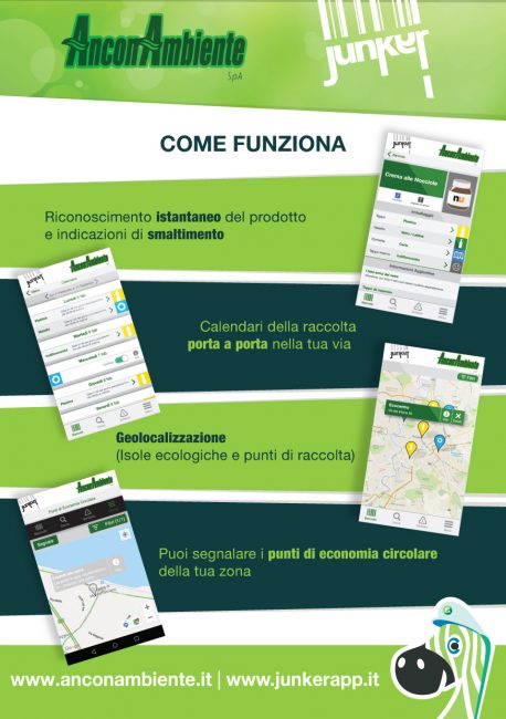 Si chiama Junker da «junk», rifiuto in inglese, e parla 10 lingue. è la nuova app ideata da AnconAmbiente per riconoscere in un solo clic ciò che stiamo gettando e che ci dice come differenziare secondo la normativa del territorio. Attiva già da oggi nei comuni di Ancona, Fabriano, Sassoferrato e Serra De’ Conti, è gratuita e dà anche la possibilità di comunicare molte altre informazioni, come l’ubicazione dei punti di raccolta e dei CentrAmbiente, i calendari del porta a porta e le indicazioni per i rifiuti speciali, permettendo così di evitare sanzioni.