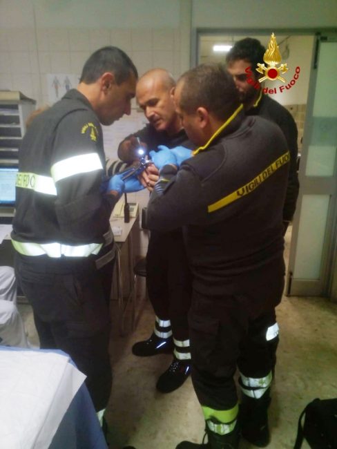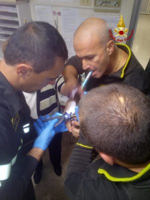 Punta da un insetto rischia di andare in shock anafilattico. Con la mano sinistra gonfia corre al pronto soccorso e per liberare le dita dagli anelli incastrati arrivano anche i vigili del fuoco all’ospedale di Chiaravalle. E’ successo nella tarda serata di ieri, 30 ottobre. Le dita della mano della donna aveva cominciato a gonfiarsi e non c’era verso di togliere l’anello. Tra il dolore, la difficoltà circolatoria del sangue, i medici hanno tentato con tutti i mezzi disponibili di liberare la mano dalla morsa, ma nessuna sostanza lubrificante o azione meccanica ha funzionato. Ai sanitari non è rimasto che chiedere aiuto ai vigili del fuoco che poco dopo sono intervenuti al Pat dell’ospedale di Chiaravalle per soccorrere la paziente.. I pompieri sono entrati in sala emergenza e utilizzando le cesoie, hanno tagliato i monili diventati troppo stretti sfilandoli dalle dita della malcapitata. Dopo un lavoro certosino e paziente, passato per lo più a rassicurare la paziente e ad evitare di provocarle tagli ben più gravi sulla mano, sono riusciti ad estrarre gli anelli consentendo così ai sanitari di adottare le cure necessarie per ripristinare la circolazione sanguigna della mano.