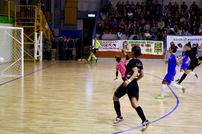 Falconara cala il poker e fa suo il derby delle Marche contro il Flaminia Fano al termine di una gara dominata in lungo e in largo in un PalaBadiali rinnovato con il nuovo fondo in parquet. Festa cittadina con sindaco, assessori, autorità cittadine e taglio del nastro pomeridiano. Poi, alle 19, posticipo serale della quinta giornata di campionato con la tribuna piena per sostenere le squadre. Pronti, via e le Citizens iniziano a macinare gioco e azioni anche se il gol, complice anche la reattività di Faccani tra i pali fanesi, tarda ad arrivare. Ci provano con potenti diagonali dalla destra prima Luciani, poi De Angelis. Qualche minuto ed è Pascual al volo, servita da De Angelis, a impegnare Faccani. Ancora Luciani e stavolta è il legno a mantenere lo 0-0. Il Flaminia fa quel che può. Bene in difesa dove spicca capitan Berti ma tanta fatica sulle ripartenze. Il che agevola le falconarese che però, senza Nanà acciaccata, finalizzano poco. Fino al capolavoro di Sofia Luciani che rompe l’equilibrio. Il capitano recupera palla e parte, triangola con Dalla Villa al limite dell’area e si presente a tu per tu da Faccani, freddata con un potente destro. Per la numero 10 è il 63esimo gol in 102 partite con la maglia del Città di Falconara. Nella ripresa il Fano prova ad alzare il baricentro ma a quel punto il Falconara ne approfitta per dilagare. Sale in cattedra De Angelis: percussione centrale e palla d’oro sul secondo palo per l’accorrente Pascual. Il Flaminia cerca di creare qualcosa per accorciare le distanze: Antonaci, inoperosa fino a quel momento, è chiamata in causa da Berti. Il 3-0 arriva su tiro libero assegnato dall’arbitro con il sesto fallo delle ospiti (Giovanelli, giallo per lei, su Luciani lanciata da centrocampo). Il sinistro di Ciferni è letale. Fano ancora avanti ma non è davvero giornata. Dalla pericolosissima conclusione di Berti, decisiva Antonaci, parte il contropiede che sull’asse Luciani-De Angelis porta Sevilla al tiro del 4-0. Fine dei giochi, festa Falconara sugli spalti e testa a domenica per la trasferta calabrese a Lamezia. “Abbiamo avuto qualche difficoltà in fase conclusiva – commenta mister Massimiliano Neri – siamo state mature nel creare gioco senza fermarci mai. Il gol del primo tempo ci ha dato fiducia e nel secondo tempo abbiamo trovato più spazi. Avremo da qui in avanti partite complicate ma stiamo lavorando bene e dobbiamo continuare così”.