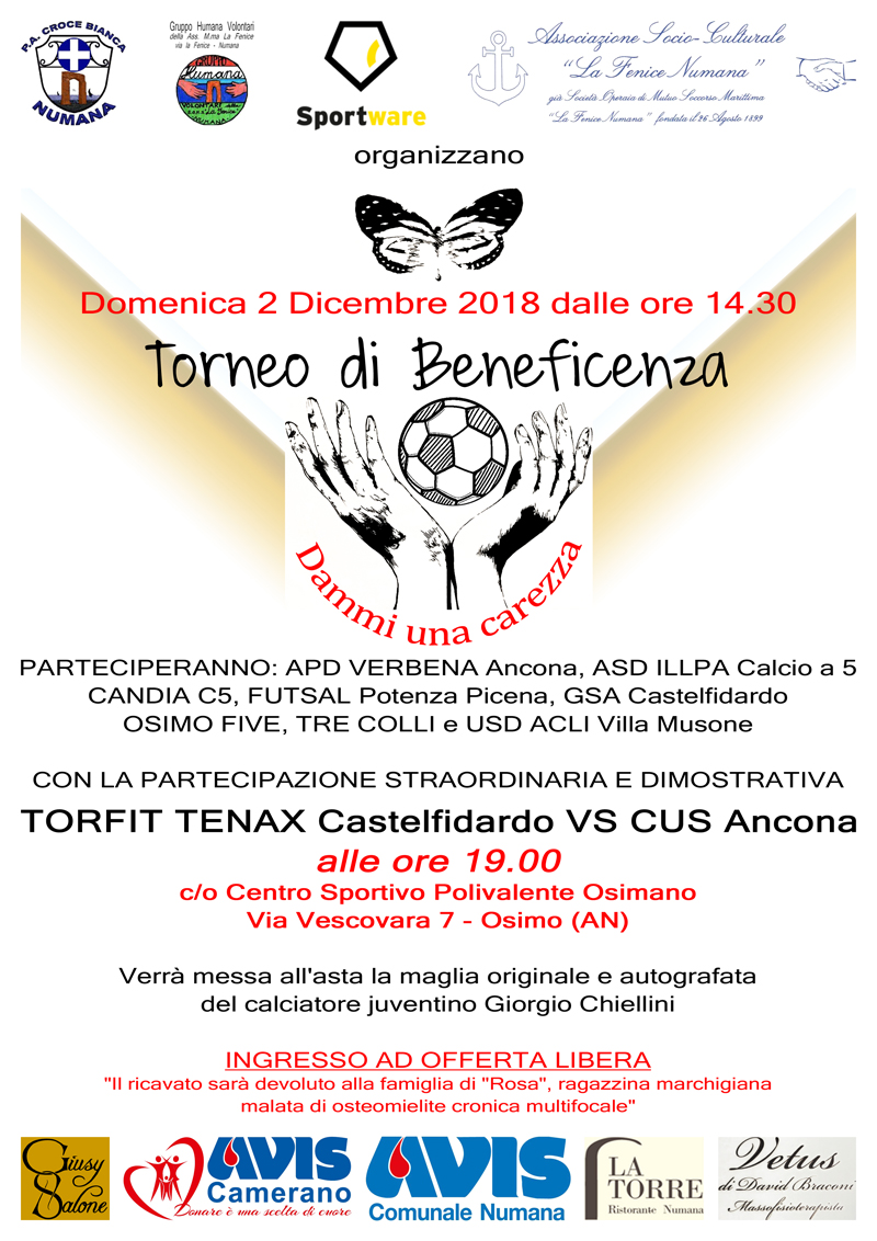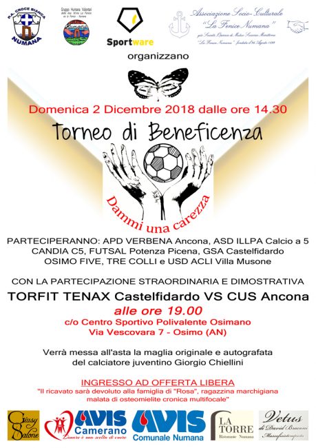 Domenica 2 dicembre prossimo le associazioni di volontariato numanesi Gruppo Humana volontari, Pubblica assistenza Croce Bianca , associazione culturale La Fenice, hanno organizzato, assieme alla Sportware di Osimo, un grande evento di solidarietà dal titolo “Dammi una carezza”: si tratta di raccolta fondi a sostegno di ‘Rosa’, nome di fantasia per una ragazzina marchigiana affetta da una grave malattia chiamata Osteomielite Cronica Ricorrente Multifocale. L’evento si terrà a partire dalle ore 14.30 presso i campi del Cespo di via Vescovara 7, Osimo dove si fronteggeranno l’Apd Verbena Ancona, Asd Illpa Calcio a 5 Candia, C5 Futsal Potenza Picena, Gsa Castelfidardo, Osimo Five, 3 Colli e Usd Acli Villa Musone.