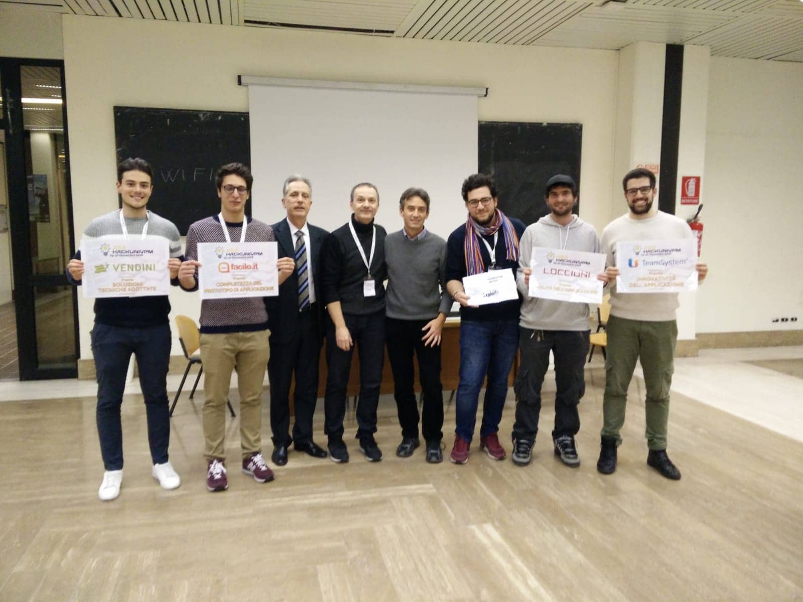 Incetta di premi invece per il gruppo Exploits per la migliore innovatività dell’applicazione da TeamSystem, per la validità delle soluzioni tecniche adottate assegnato da Vendini, premio per la qualità dell’applicazione messo in palio da Loccioni e completezza del prototipo di applicazione da parte di Facile.it. Il gruppo ‘Exploits’ è composto da: Simone Accattoli (LM – Fac. Ingegneria), Gianluca Bonifazi (LM – Fac. Ingegneria), Niccolò Marini (LM – Fac. Ingegneria), Luca Mazzieri (L – Fac. Ingegneria) e Federico Simonetti (LM – Fac. Ingegneria).