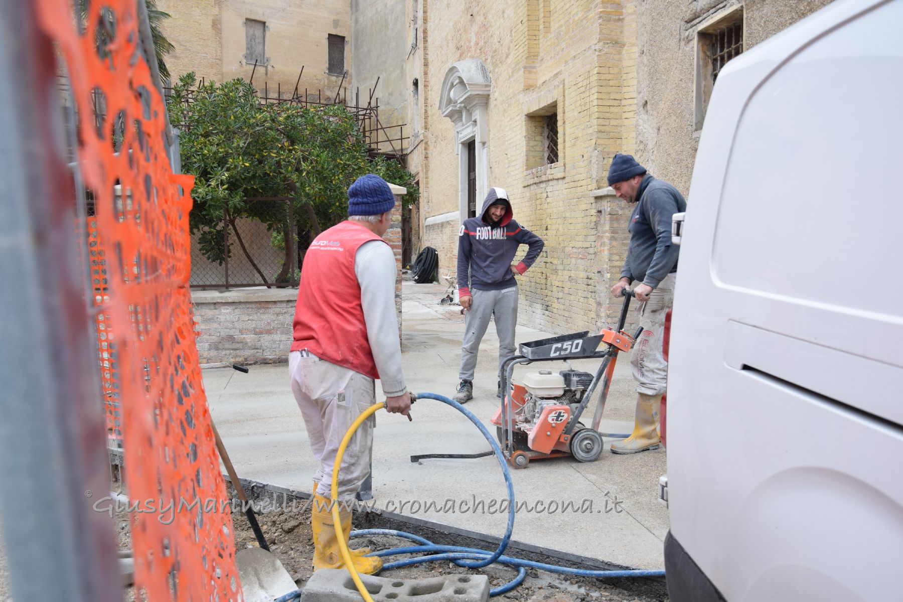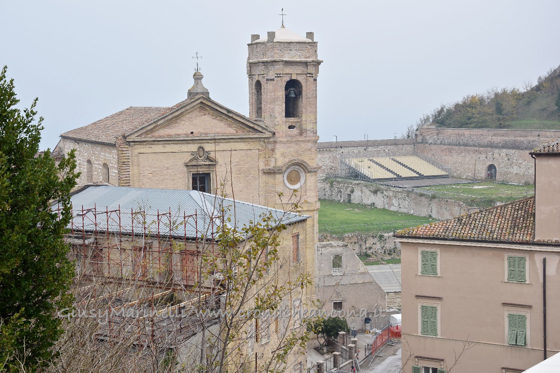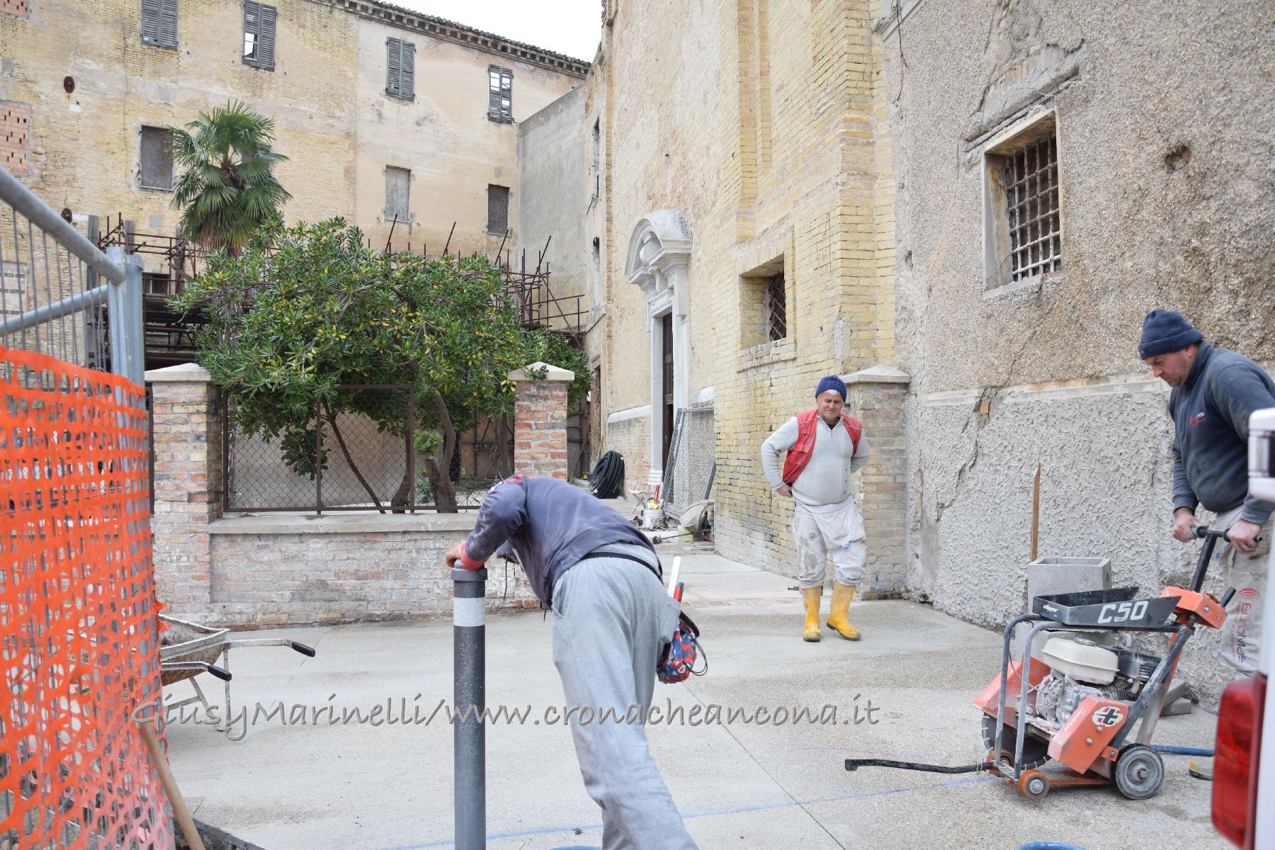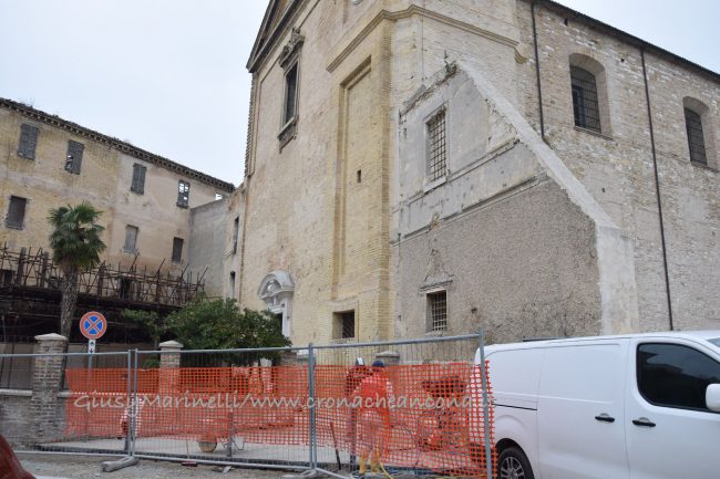 La chiesta, d’impianto cinquecentesco-settecentesco, è stata completamente ristrutturata, grazie ad un cantiere estenuante e a singhiozzo avviato nel lontano 1973, dopo il terremoto dell’anno precedente che aveva provocato gravissimi danni; cantiere che aveva subito un’accelerazione negli anni ’80; poi, tra uno stop e un altro, aveva proceduto spedito in questi ultimi anni. Spesa complessiva, a carico del Segretariato generale Marche del Mibact, quasi 1 milione di euro. In questi giorni, sotto la supervisione della Soprintendenza, tecnici e operai stanno terminando il montaggio della nuova ringhiera metallica che delimita il sagrato e si allunga sul lato sinistro fino all’ingresso dell’ex complesso Birarelli. Ma il sagrato non è più quel delizioso mini-giardino che fu realizzato quando nel 1847 la chiesa e il “fu” convento annesso furono assegnati alle Monache Armene (chiesa che in quell’occasione mutò il titolo dall’originario San Bartolomeo in San Gregorio Armeno): è una spoglia piattaforma di cemento dove resistono solo un paio di piante. Una sistemazione provvisoria, precisano dalla Soprintendenza – ma che si profila molto lunga – in quanto il sagrato verrà ristrutturato più degnamente quando, grazie a 4 milioni di euro stanziati dal Mibact, sarà avviato e completato il progetto di lavori del Segretariato generale Marche e della Soprintendenza. Progetto che prevede il totale restauro dell’ex Orfanatrofio Giovanni Birarelli (cadente e in abbandono da decenni) e le vecchissime quanto degradate casette di fronte alla chiesa, per costituire un polo per eterogenei eventi culturali ed ospitare, pare, archivi e biblioteche della Soprintendenza.