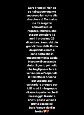 Su Twitter una tifosa juventina invita il campione della Roma Francesco Totti a fare i suoi auguri speciali a Michele, convinta che la spinta emotiva di Totti, possa aiutare una più veloce ripresa del ragazzo. “Vieni a trovare un tuo grande tifoso che lotta tra la vita e la morte all’ospedale di Torrette − si legge nell’invito − il gesto più bello che tu possa fare è venire qui all’ospedale di Torrette di Ancona per vederlo, per salutarlo, per pregare per lui. Daje France’ vieni in fretta!”. E il campione, sempre in prima linea quando si tratta di solidarietà, non ha fatto tardare la sua risposta incoraggiando Michele a riprendersi velocemente dandogli appuntamento a Trigoria.