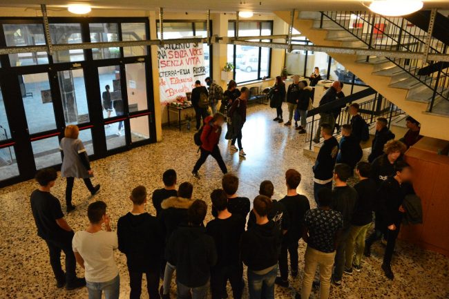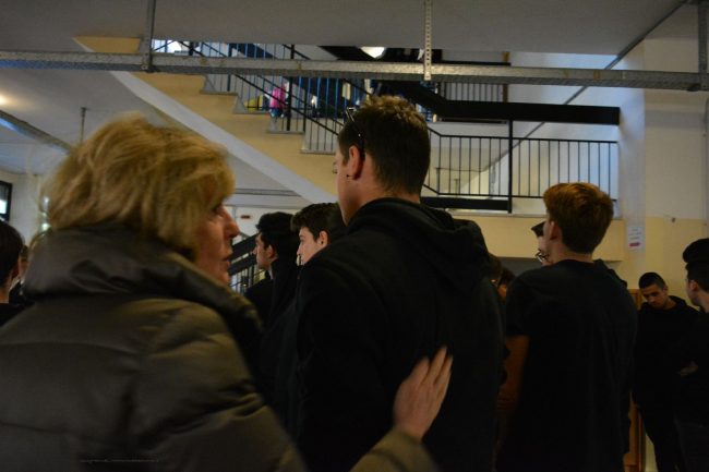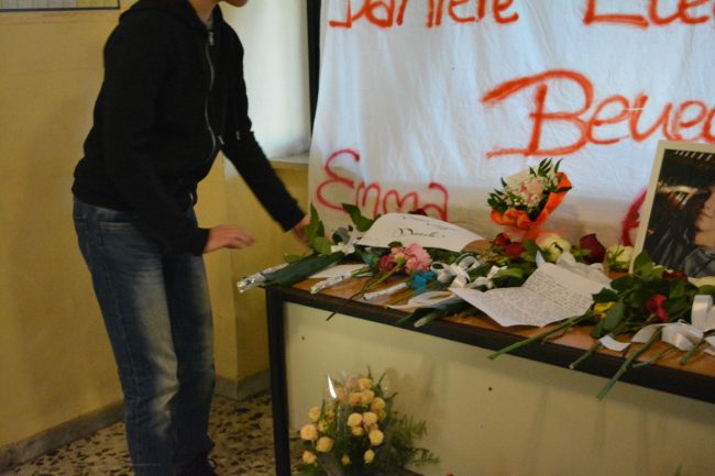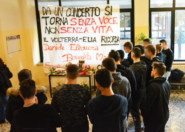 “Da un concerto si torna senza voce non senza vita”. Con queste parole impresse su uno striscione gli studenti dell’Iis “Volterra-Elia” di Ancona questa mattina hanno ricordato il loro compagno di scuola Daniele Pongetti e gli altri giovani Mattia, Emma, Asia, Benedetta ed Eleonora (la mamma che aveva accompagnato la figlia alla serata della Lanterna Azzurra) che come lui sono morti nell’inferno di Corinaldo. Poi un banco sotto ad una delle finestre della scuola, con fiori, lettere e messaggi indirizzati ai cinque adolescenti ed alla mamma vittime del crollo della balaustra in discoteca. Un giorno mesto e carico di dolore ed incredulità per quel compagno che non ha fatto più ritorno da un concerto. Un momento nel quale pensi al massimo di perdere la voce e non certo la vita. Nella scuola di via Esino, come in altre molte scuole della città e della regione, oggi in segno di lutto gli studenti indosseranno delle maglie nere.