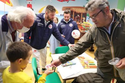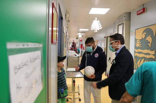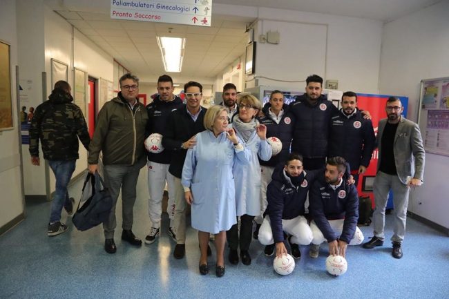 SORPRESE - Una delegazione di calciatori e dirigenti ieri mattina nei reparti del materno-infantile per portare i saluti di Natali ai piccoli pazienti ricoverati
