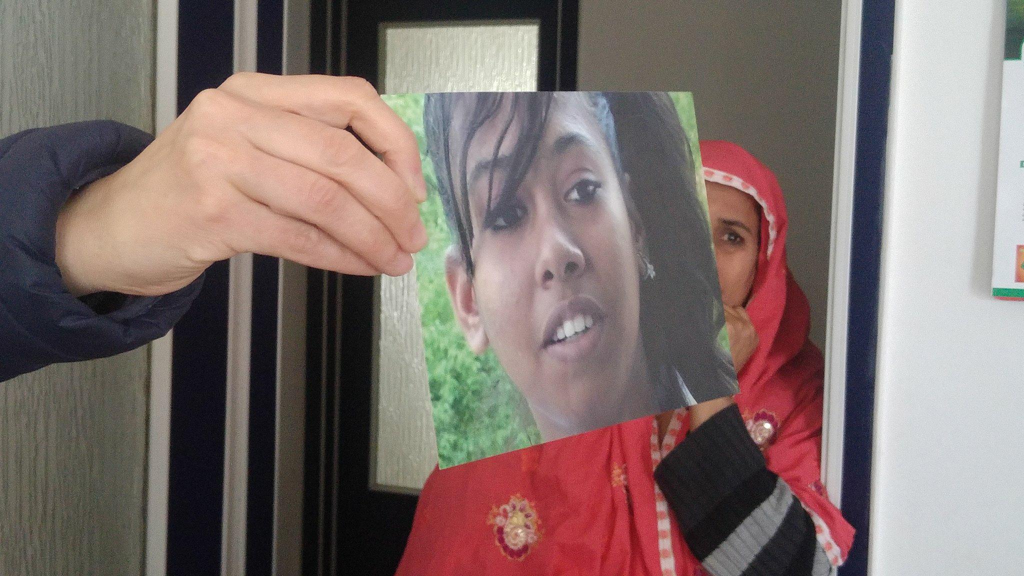 Fatema, la madre di Cameyi Mosammet con la foto della figlia scomparsa. Il caso viene risolto nel mese di marzo, a 9 anni dalla sparizione da Ancona della studentessa 15enne di origine bengalese. Le sue ossa vengono rivendute insieme ad altri resti umani nel pozzo dell’orrore all’Hotel House di Porto Recanati